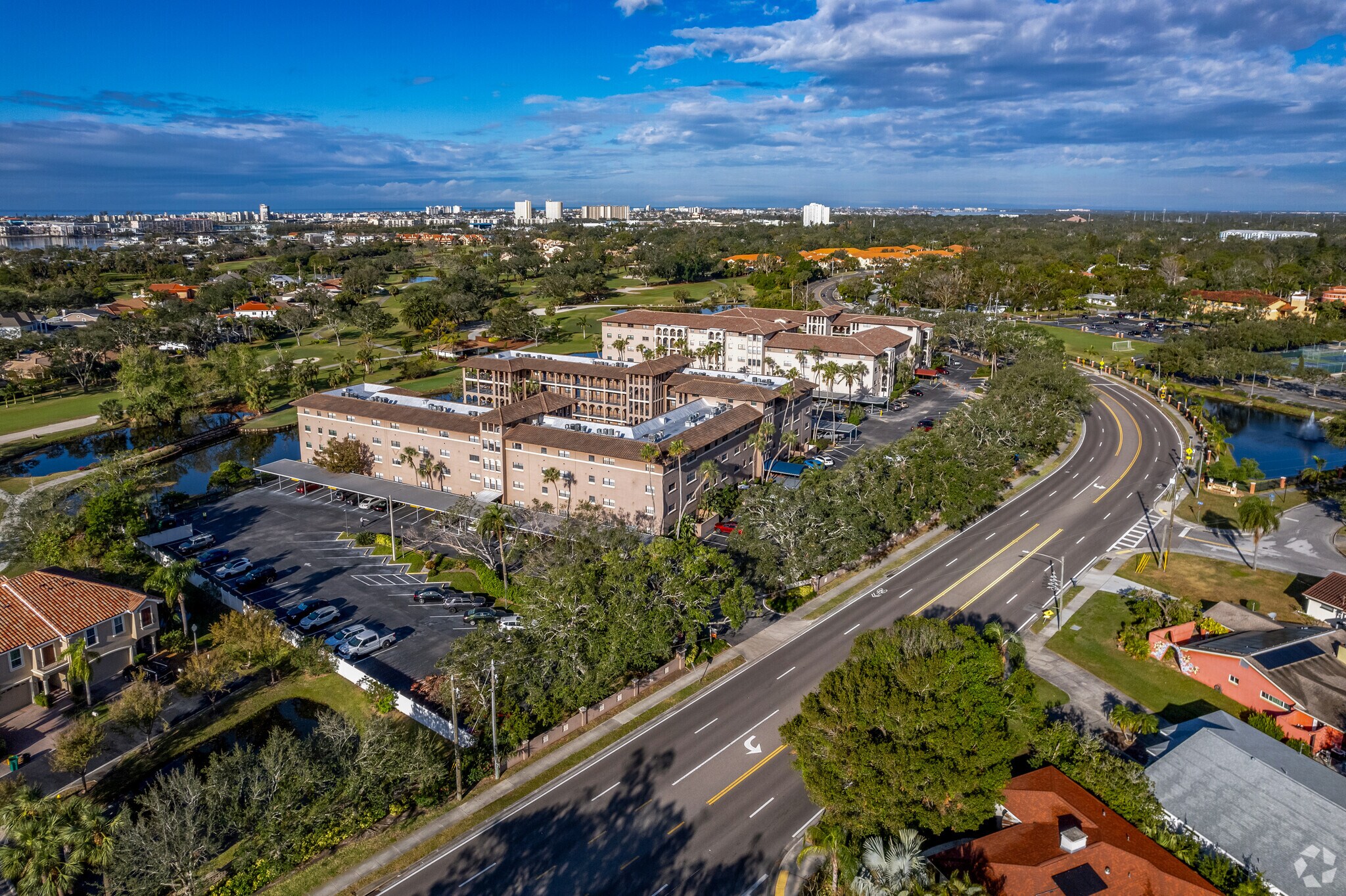 Golfview Condominiums, completed in 1973, stands as a tranquil residential enclave in the Pasadena Yacht and Country Club neighborhood of Gulfport, Florida. This four-story complex houses 149 units, offering residents a peaceful lifestyle with picturesque views of the adjacent golf course and pristine ponds. The building's stucco exterior and arched ground-level openings lend a touch of Mediterranean charm to its design. Situated across from Stetson University College of Law, Golfview Condominiums provides a perfect blend of academic proximity and recreational serenity.