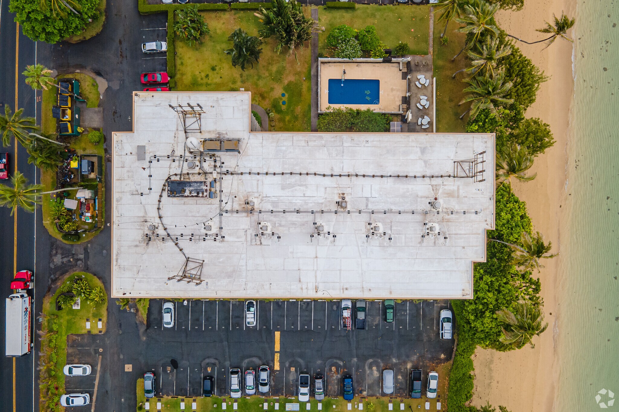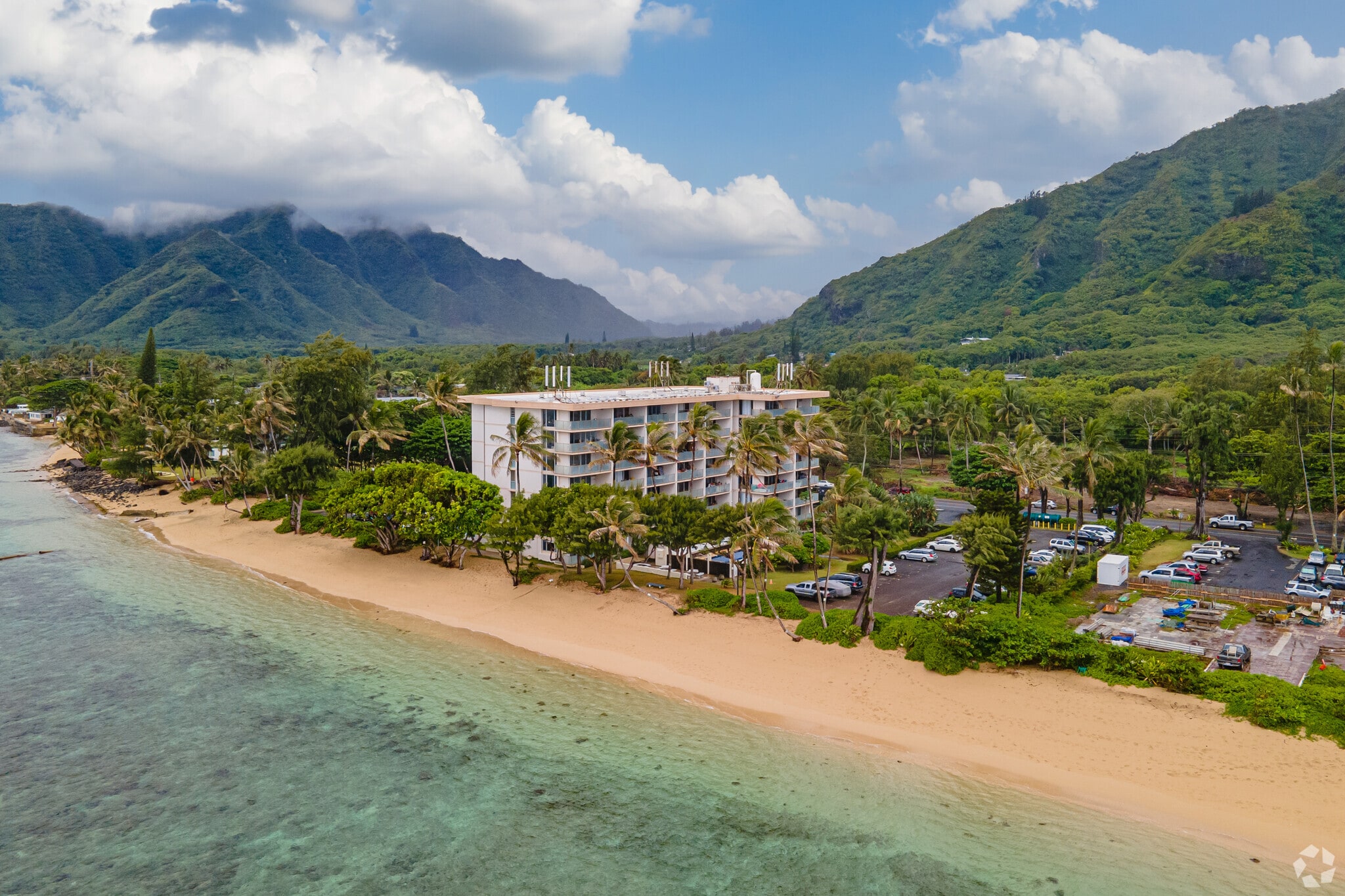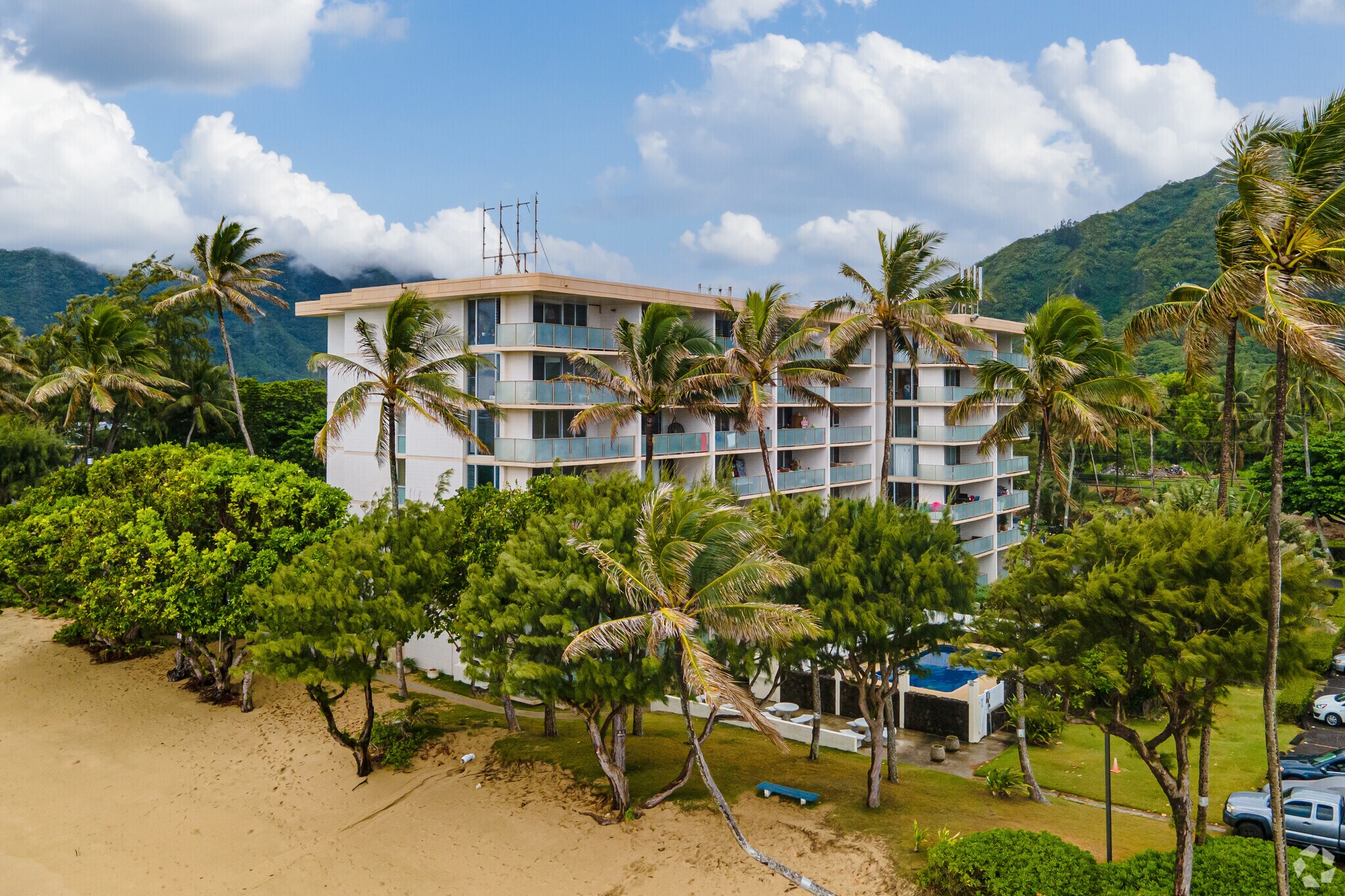 Hanohano Hale, a 7-story condominium complex completed in 1973, stands as a testament to beachfront living on Oahu's picturesque windward coast. Located in the serene Koolauloa region, this 131-unit building offers residents a chance to embrace the laid-back coastal lifestyle. The structure, while simple in design, provides a perfect backdrop for the stunning ocean views and lush mountain landscapes that surround it. Large windows throughout the building invite ample natural light, creating bright and airy living spaces that capture the essence of island life.