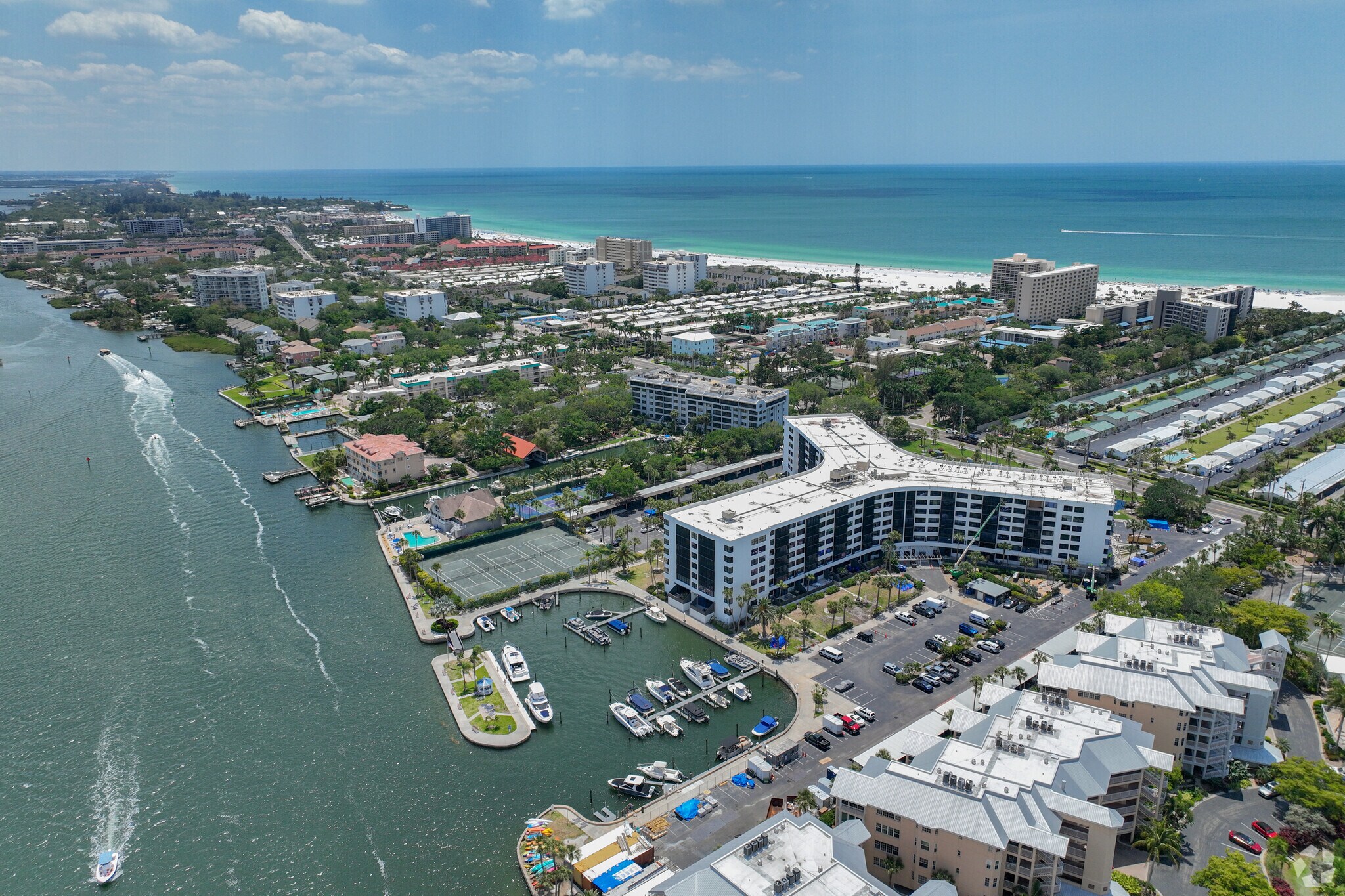 Harbor Towers Yacht & Racquet Club is a seven-story condominium building located on the picturesque Siesta Key, off the coast of Sarasota. Completed in 1976, this modern structure houses 211 units and offers a blend of glass and solid paneling on its exterior. The building's prime location provides residents with easy access to the renowned Siesta Beach, known for its white quartz sand and vibrant community atmosphere.