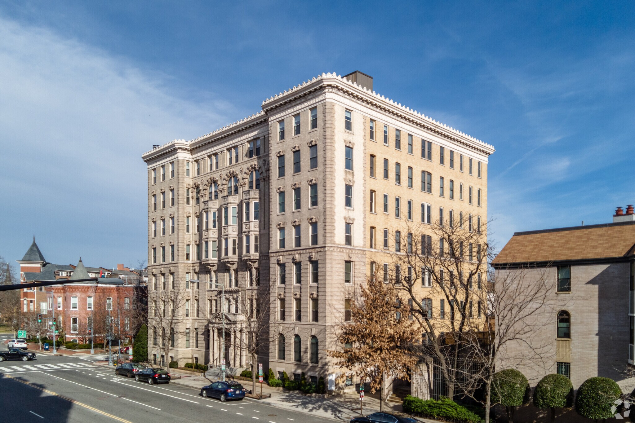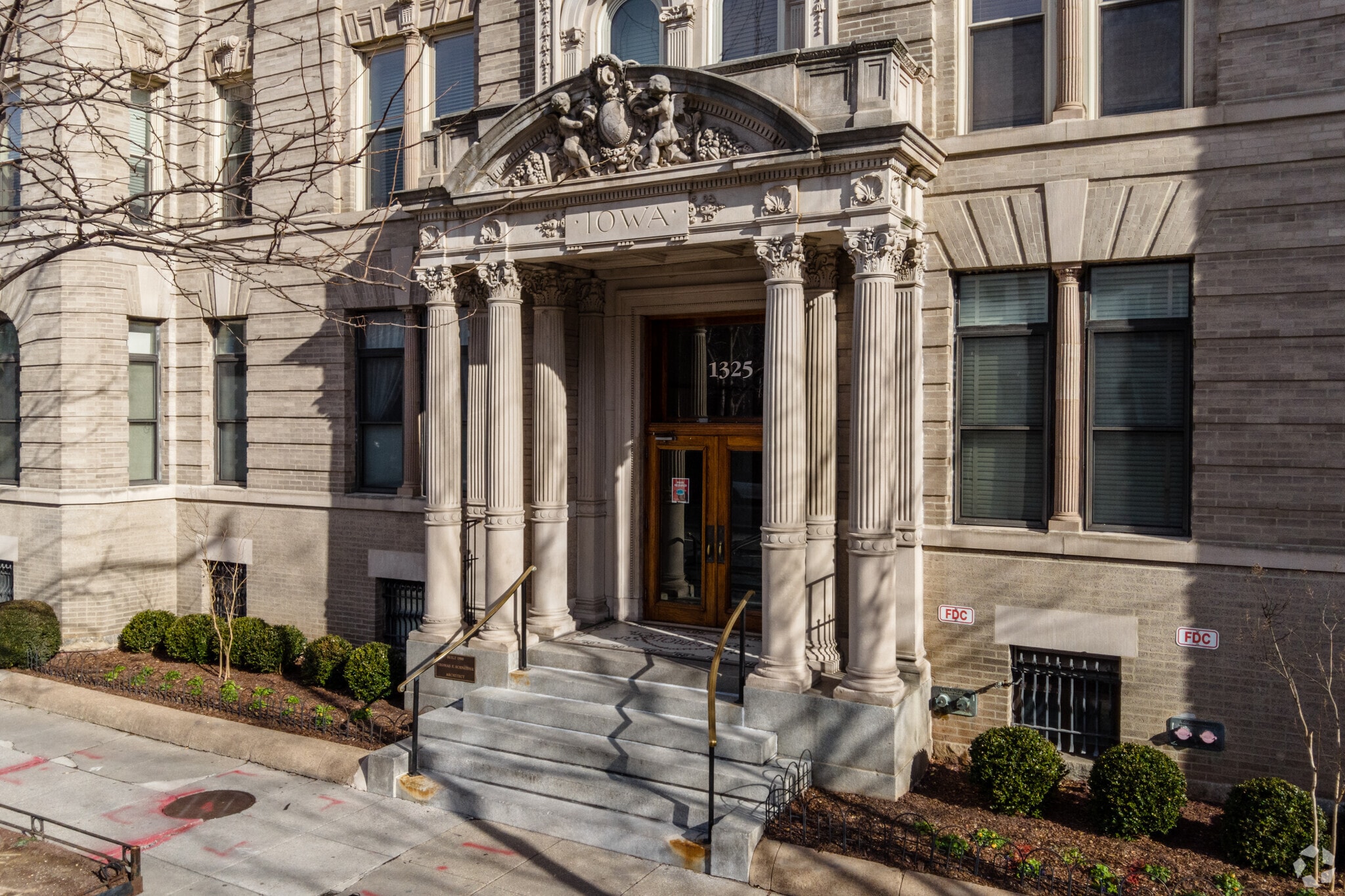 The Iowa Condominiums, designed by Thomas Franklin Schneider and completed in 1875, stand as a seven-story testament to the Beaux-Arts architectural style. Located in the vibrant Logan Circle neighborhood, this building features 98 units and is known for its elaborate stone facade, decorative carvings, and grand entrance with Corinthian columns. The Iowa Condominiums blend historic charm with modern living, offering a unique residential experience in one of D.C.'s most sought-after areas.