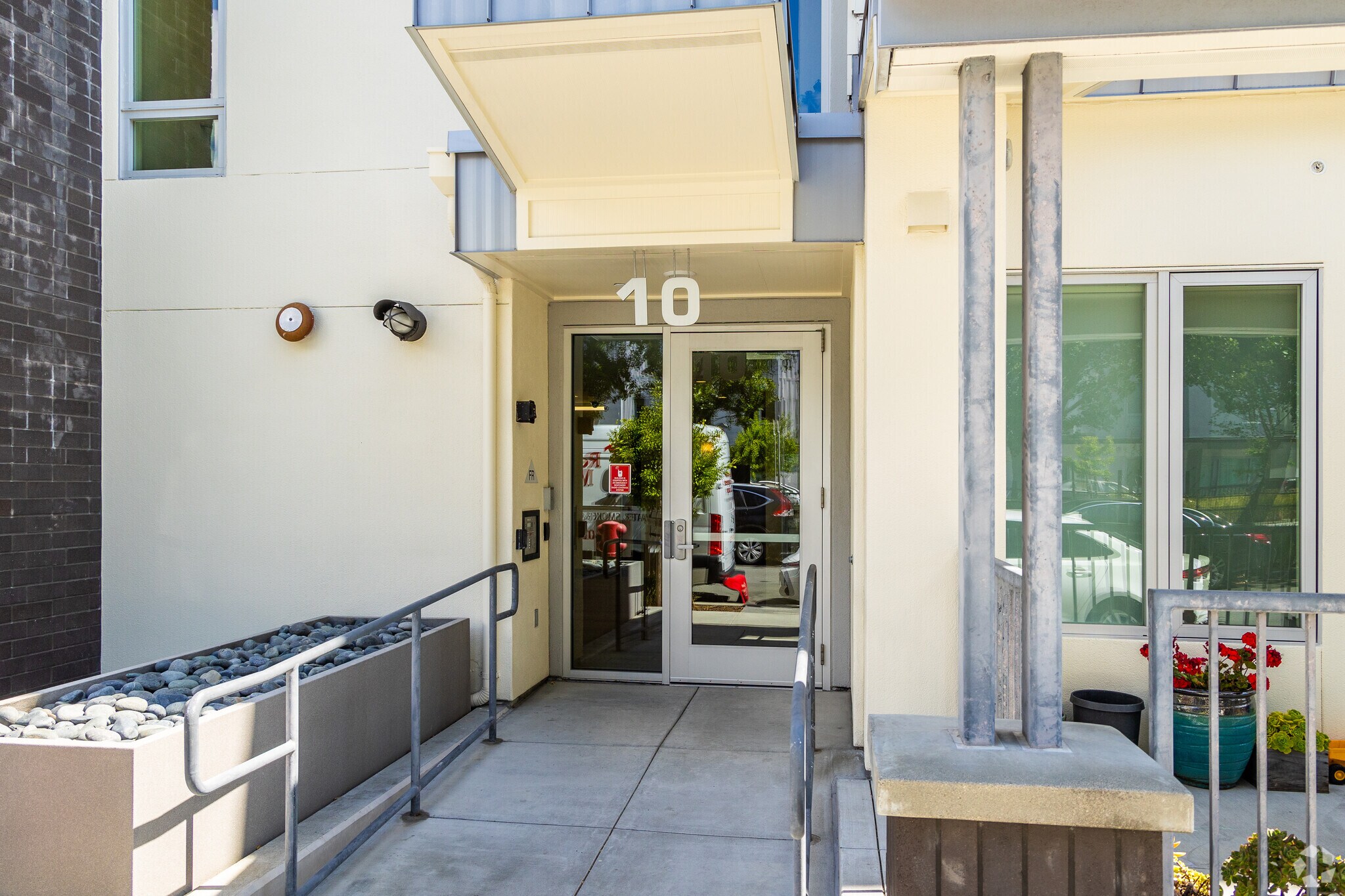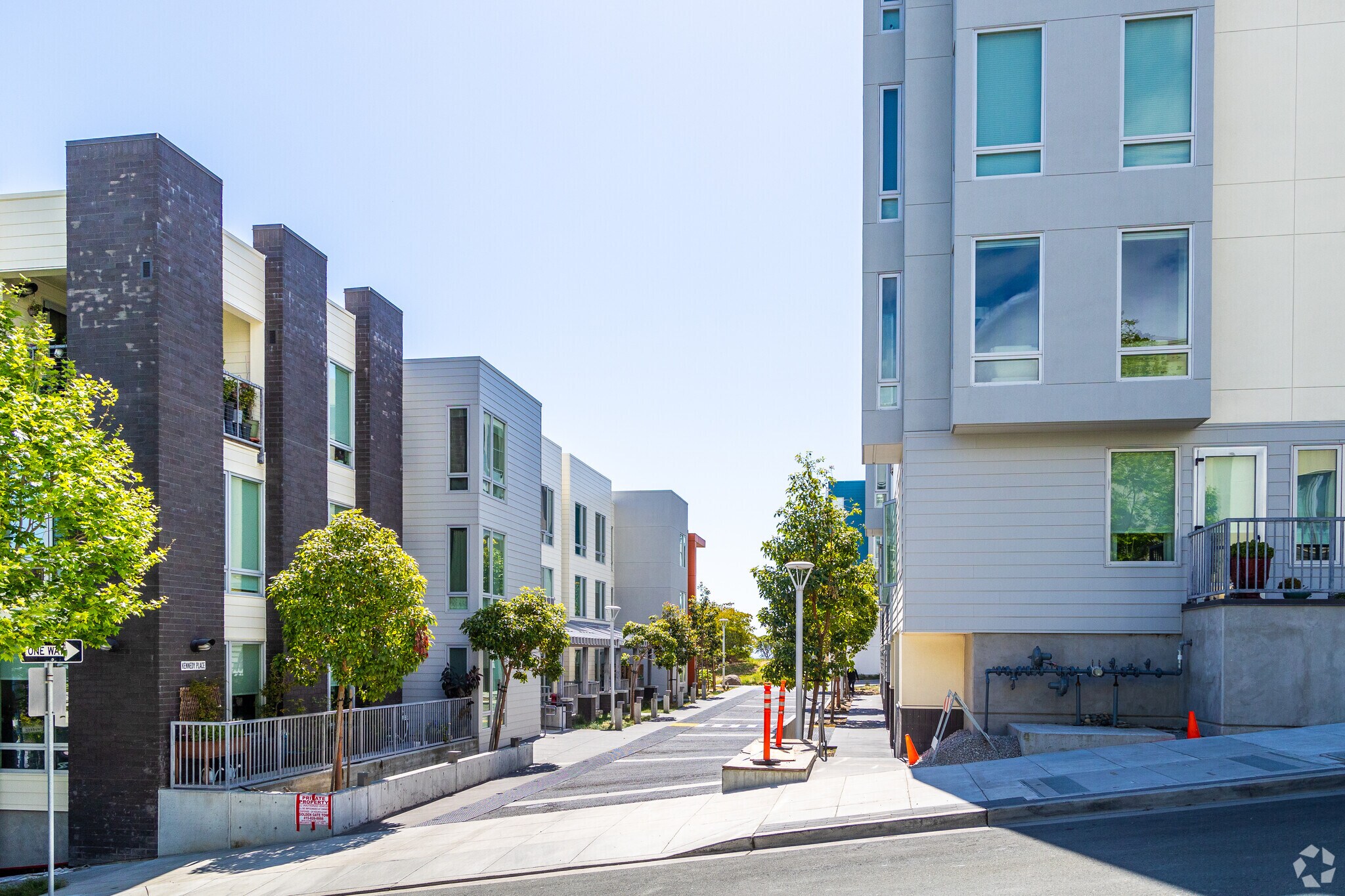 Landing, a contemporary condominium building, stands proudly in the Hunters Point neighborhood of San Francisco. Completed in 2017, this four-story structure houses 60 units, offering a blend of modern design and urban convenience. The building's clean, boxy appearance, accented with neutral tones and blue highlights, complements its surroundings while providing a fresh, inviting atmosphere for residents.
