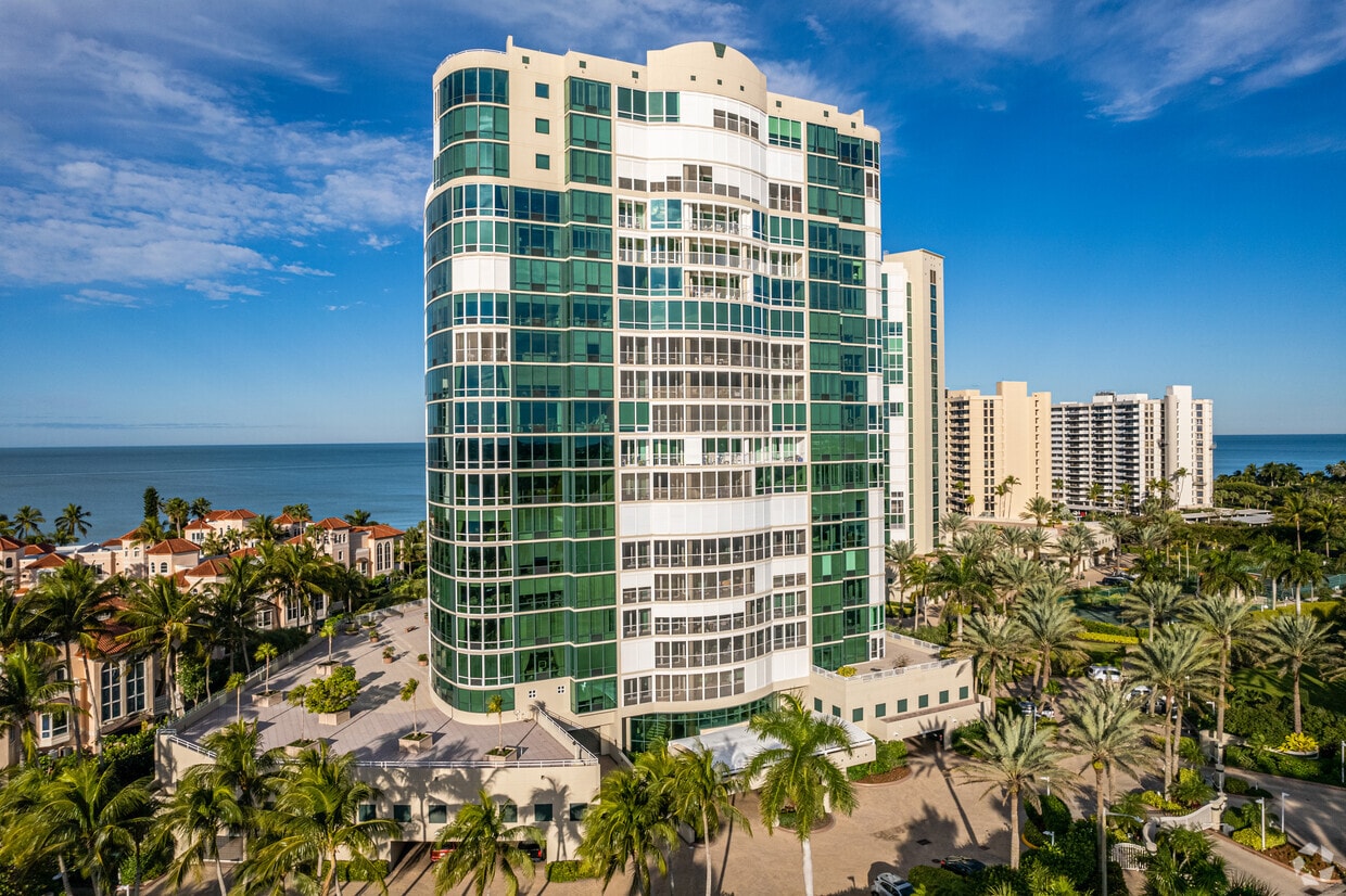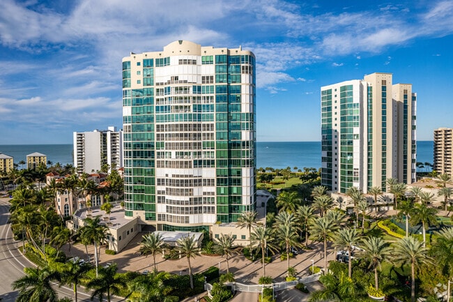 Le Ciel Venetian Tower, a 21-story condominium completed in 1994, stands as a prominent feature along Gulf Shore Boulevard in the serene community of Park Shore, Naples. Designed with a curved facade and predominantly glass exterior, this modern high-rise offers 73 luxurious units. The building's symmetrical design and prominent entryway with decorative elements, including a porte-cochere, create an inviting atmosphere for residents and visitors alike.