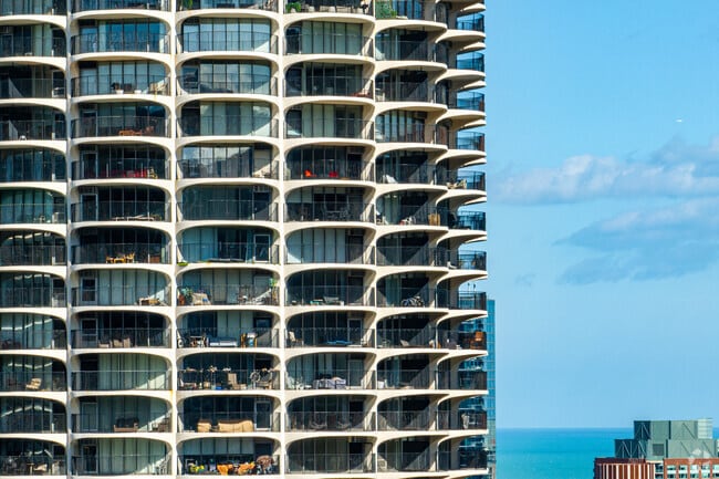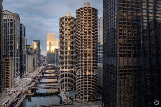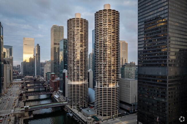 Marina City, a striking example of Modern architecture, stands tall with its distinctive cylindrical shape and continuous wrap-around balconies. This 64-story marvel was completed in 1962 and houses 896 units. Located in the vibrant River North neighborhood, Marina City is a well-known landmark, offering residents a unique urban living experience with its sculptural form and prime location.