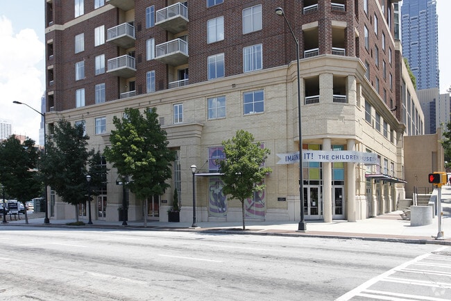 Museum Tower, a striking 25-story high-rise designed by renowned architect Smallwood, stands as a prominent fixture in Downtown Atlanta's skyline. Completed in 2003, this luxury condominium offers 166 units, providing residents with a prime location directly across from Centennial Olympic Park. The building's sleek exterior combines brick and large windows, creating a modern aesthetic that complements its urban surroundings. With its prime position, Museum Tower affords residents unparalleled views of the city's most iconic landmarks and vibrant streetscapes, embodying the essence of sophisticated urban living in Atlanta's bustling core.