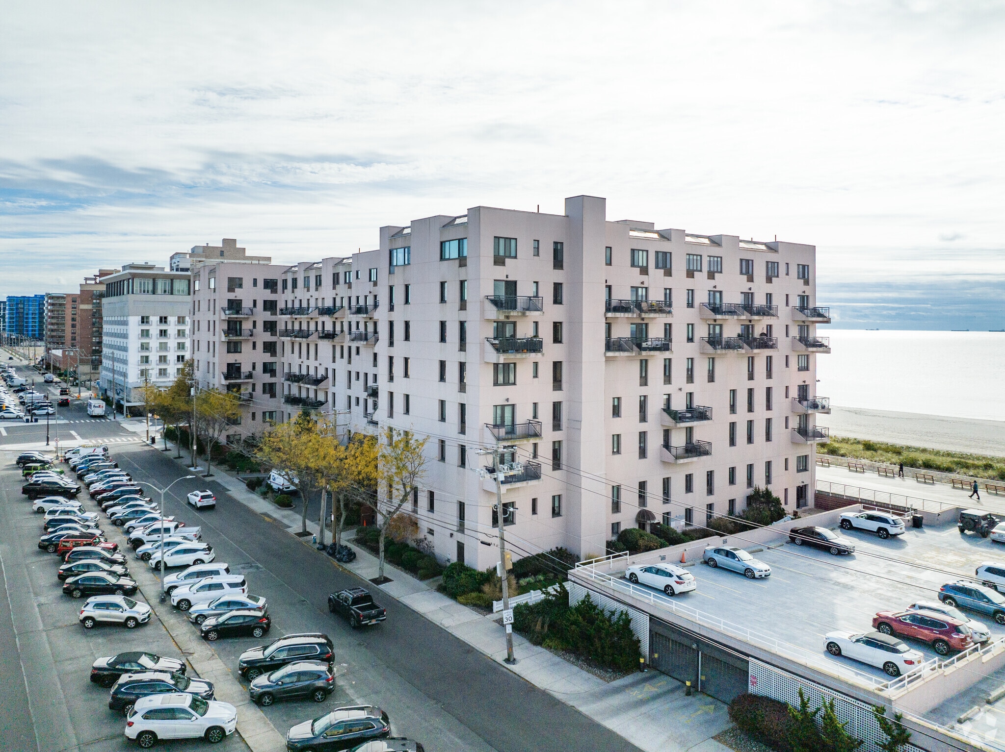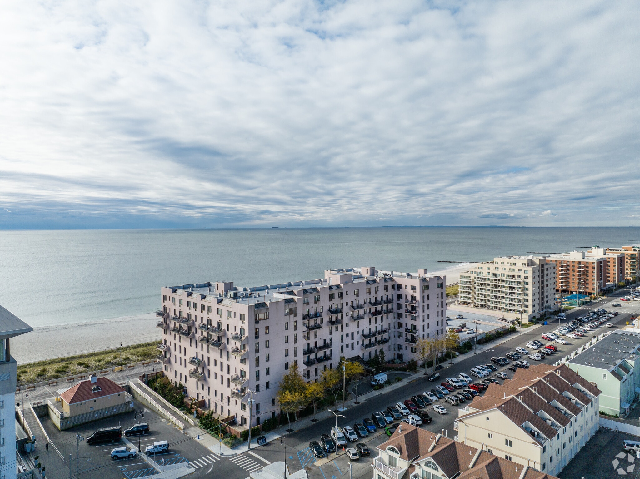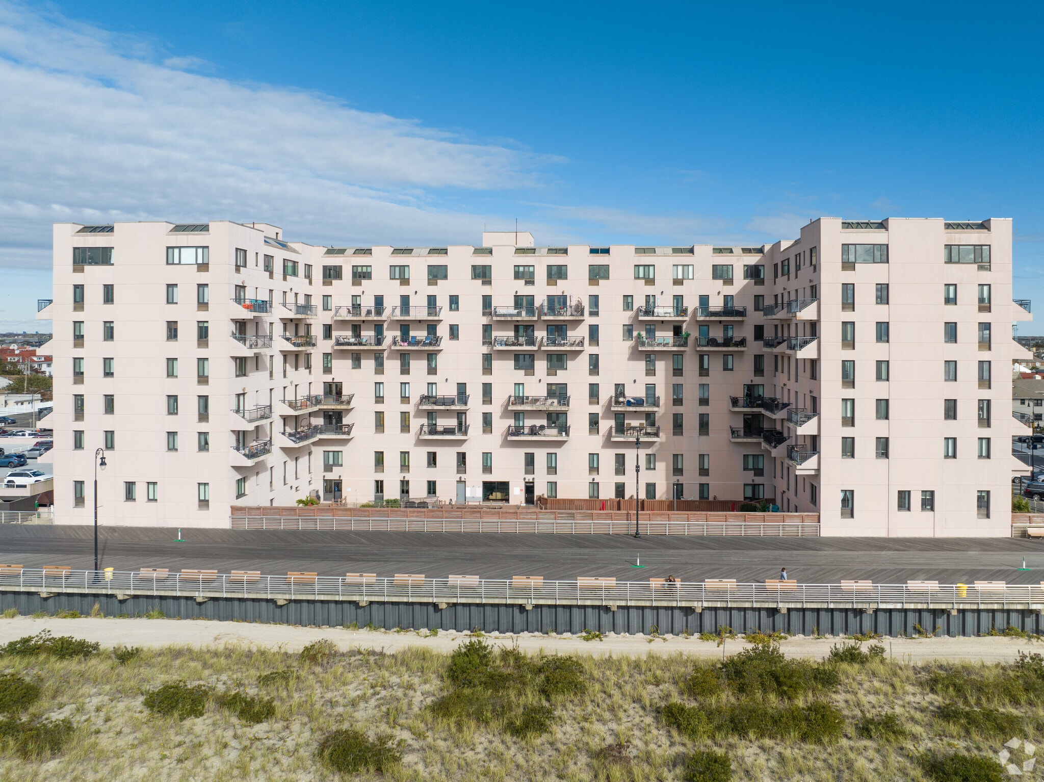 The Ocean Club at Long Beach stands as a prominent fixture on the Long Beach Barrier Island, offering a blend of coastal living and urban convenience. Completed in 1987, this 8-story condominium complex houses 152 units, each designed to maximize the breathtaking views of the Atlantic Ocean and the surrounding cityscape. Situated directly on the famous Long Beach Boardwalk, the Ocean Club provides residents with immediate access to the beach and the vibrant community that defines this oceanside locale. The building's straightforward design, featuring balconies on each floor, allows for an unobstructed connection to the natural beauty of the coastline.