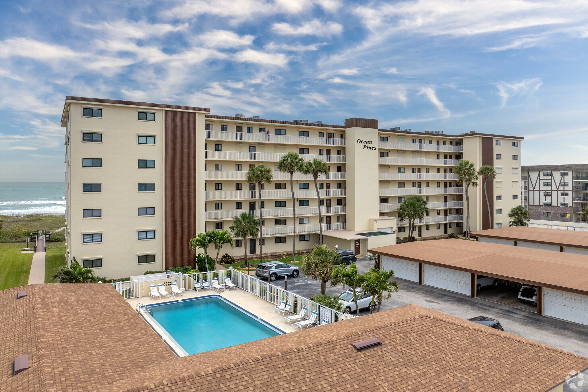 Ocean Pines, a 7-story condominium complex completed in 1981, stands as a testament to coastal living in Cocoa Beach, Florida. With 53 units offering direct views of the Atlantic, this mid-rise building combines the charm of a beachside retreat with the conveniences of modern living. Situated on prime oceanfront real estate, Ocean Pines provides residents with immediate access to the sandy shores and rhythmic waves that define the Space Coast lifestyle.