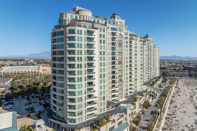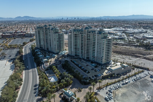 One Queensridge Place, a prestigious condominium complex in the Queensridge neighborhood of Las Vegas, stands as a beacon of luxury living. Completed in 2006 by JMA Architecture Studios - Las Vegas, this 17-story high-rise boasts 237 units, offering residents an unparalleled blend of sophistication and comfort. Situated less than 15 miles from the Las Vegas Strip, One Queensridge Place provides a serene retreat from the city's bustling energy while maintaining proximity to world-class entertainment and dining. The building's exterior features a symmetrical facade with rounded balconies and decorative crowns atop the roofline, creating a distinctive silhouette against the Las Vegas skyline.