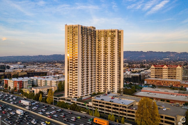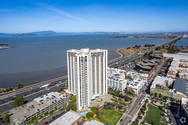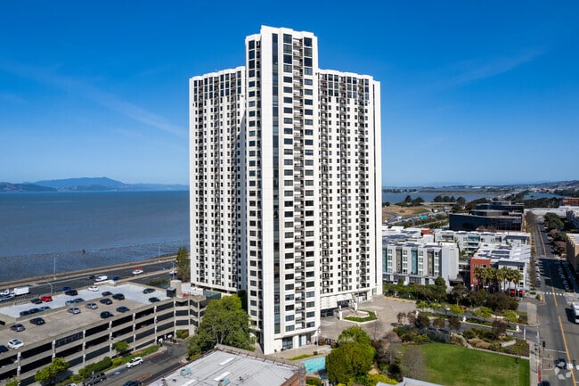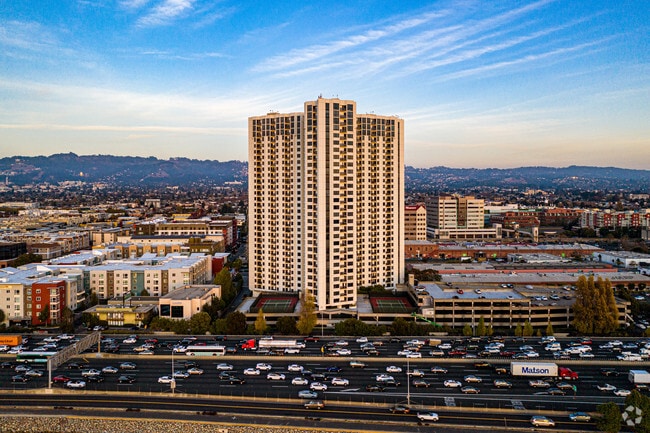 Pacific Park Plaza stands as a prominent landmark in Emeryville, offering residents a commanding presence in the East Bay skyline. Completed in 1984, this 29-story high-rise condominium, designed by Patri Merker Architects, houses 584 units. As one of the taller buildings in the area, Pacific Park Plaza provides impressive views of the surrounding landscape. The building's location puts residents at the center of Emeryville's vibrant urban scene, with easy access to shopping, dining, and entertainment options. Its distinctive height and modern design make it a recognizable feature of the Emeryville skyline, offering residents a unique living experience with panoramic vistas of the Bay Area.