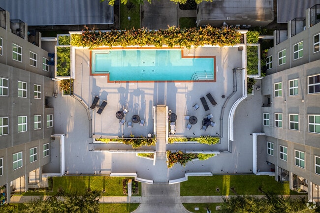 Piedmont at River Oaks is a contemporary four-story condominium building located in the vibrant Montrose neighborhood of Houston. Completed in 2006, this 80-unit building features a sleek design with a mix of curved and rectangular elements, large windows, and private balconies. The building's modern architecture complements the eclectic and artistic vibe of Montrose, offering residents a stylish and comfortable living environment.