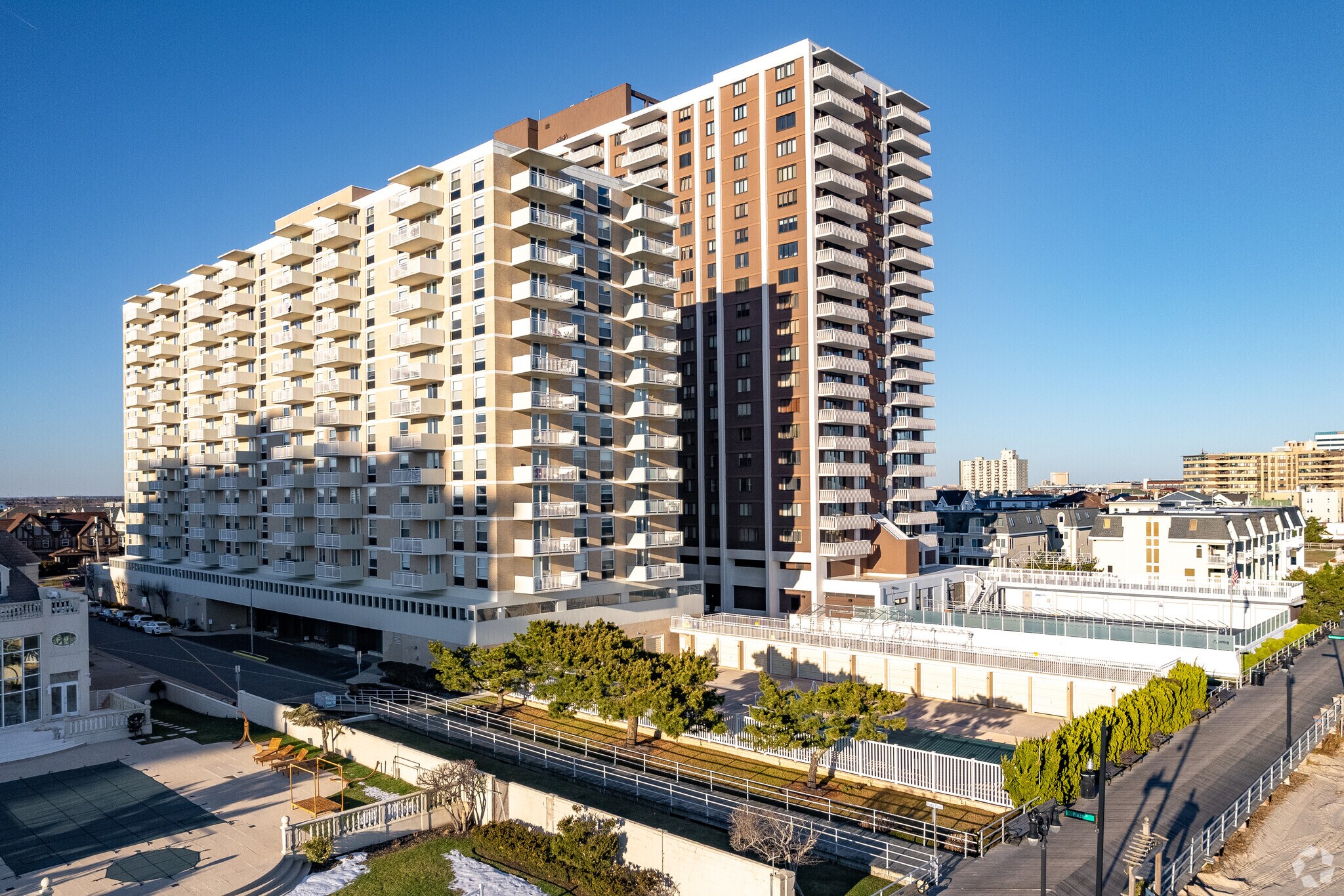 Plaza Condominium Associates stands as a prominent fixture on Atlantic City's famous boardwalk. Completed in 1965, this 14-story condominium building houses 183 units, offering residents a prime location to enjoy the vibrant coastal lifestyle. Situated in the Lower Chelsea neighborhood, the Plaza provides easy access to the beach, boardwalk, and the myriad attractions that Atlantic City is known for. The building's straightforward design focuses on maximizing ocean views, with most units featuring balconies that overlook the Atlantic. As a long-standing part of the Atlantic City skyline, the Plaza has witnessed the area's evolution, from its heyday as a resort destination to its current renaissance, marked by the recent addition of Stockton University's Atlantic City Campus nearby.