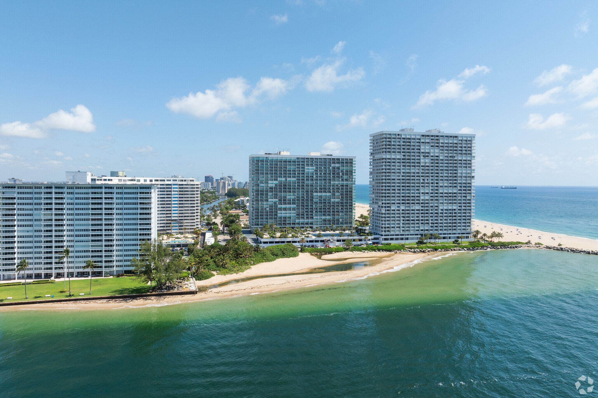 Point of Americas, a 31-story condominium tower completed in 1971, stands as a prominent fixture on Fort Lauderdale's coastline. Located in the exclusive Harbor Beach neighborhood, this 580-unit complex offers residents a prime oceanfront living experience. The building's simple, modern design features a grid-like pattern of balconies and windows, providing ample opportunity for residents to enjoy the stunning views of the Atlantic Ocean and surrounding waterways.