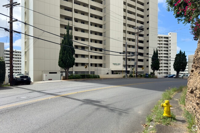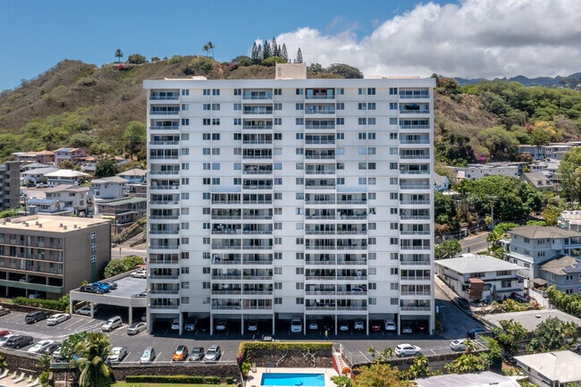 Prospect Tower, a 15-story condominium building, stands prominently in the Makiki neighborhood of Honolulu. Completed in 1967, this building features 76 units and offers a blend of modern convenience and historical charm. Its location on the slopes of Punchbowl provides residents with stunning views of the city, ocean, and mountains. The building's simple, modern design, characterized by a grid-like pattern of balconies and windows, ensures ample natural light and ventilation throughout the units.