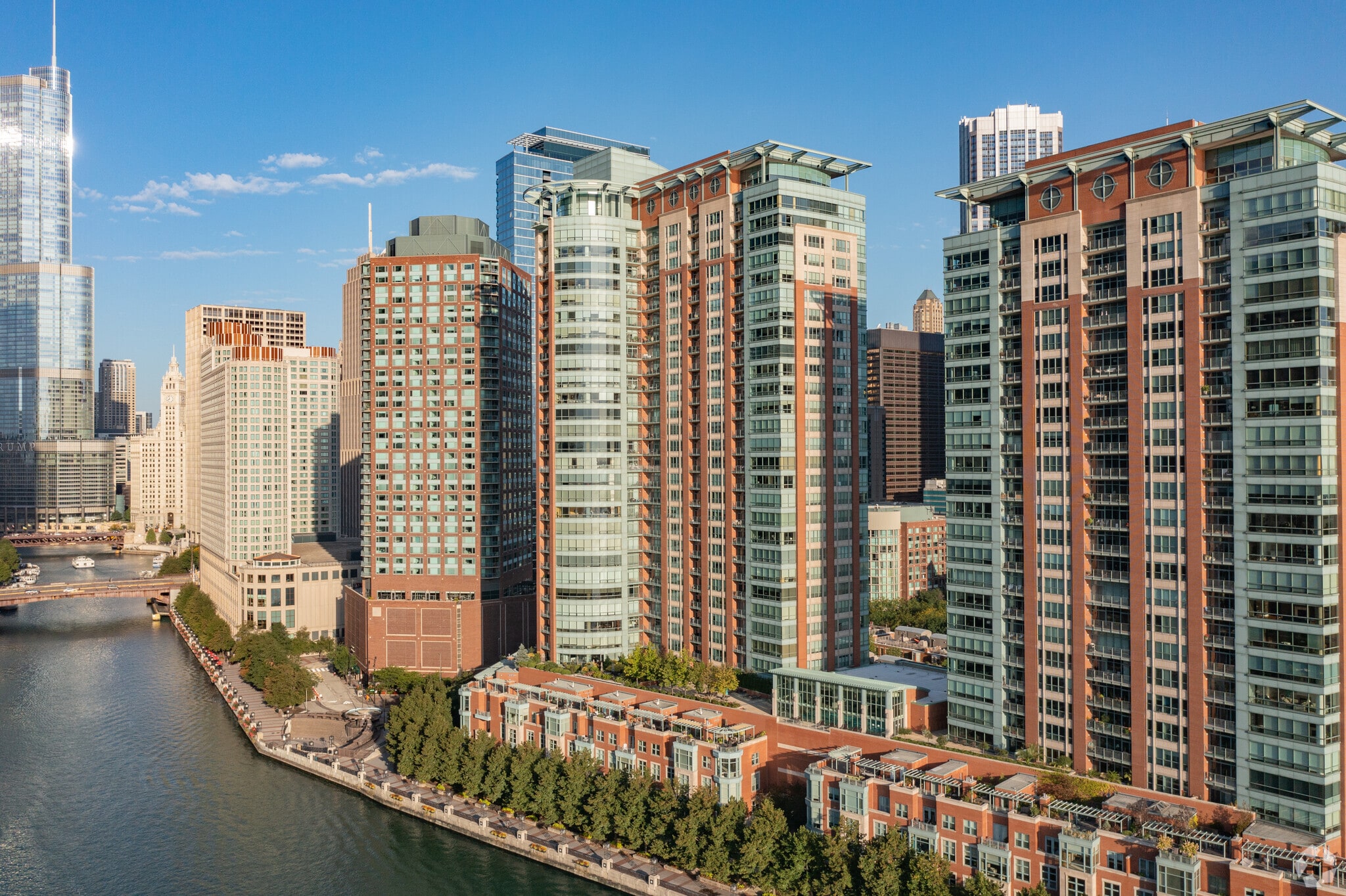 Riverview Condominiums stands tall at 32 stories in the heart of Streeterville, Chicago. Completed in 2002, this modern high-rise features 246 luxurious condo units. The building's symmetrical facade, adorned with a combination of glass and terracotta-colored cladding, offers a sleek and contemporary look. With its prime location along the Chicago River, residents enjoy stunning views of Lake Michigan, Navy Pier, and the iconic city skyline.