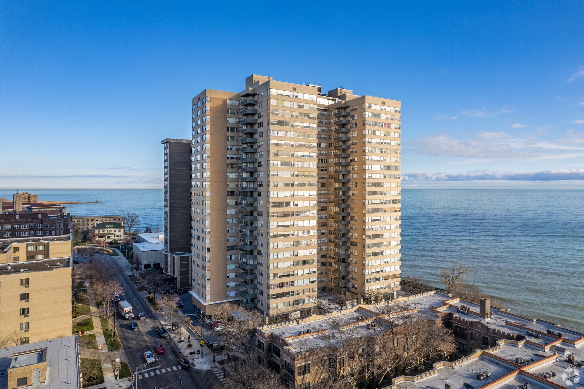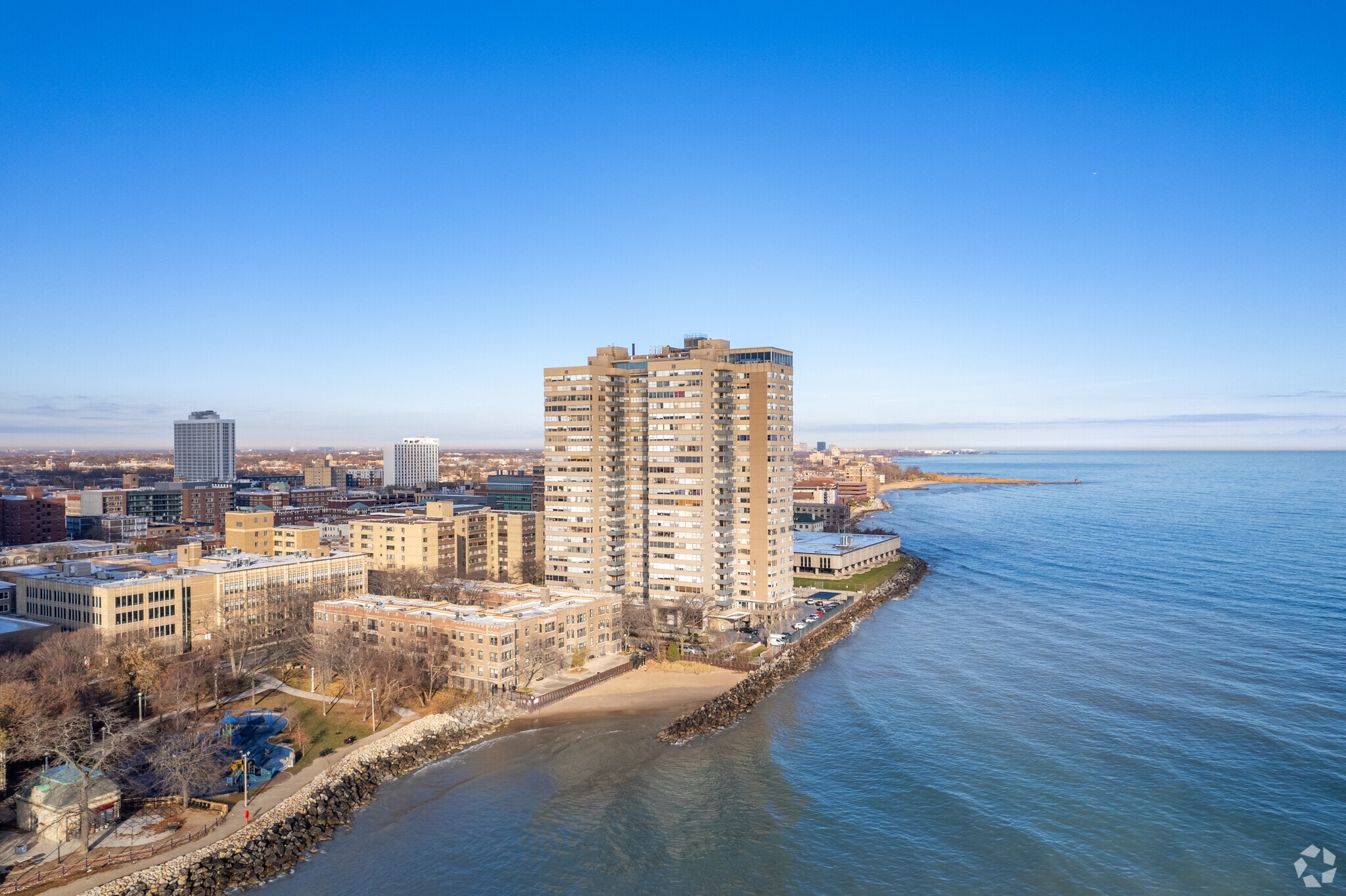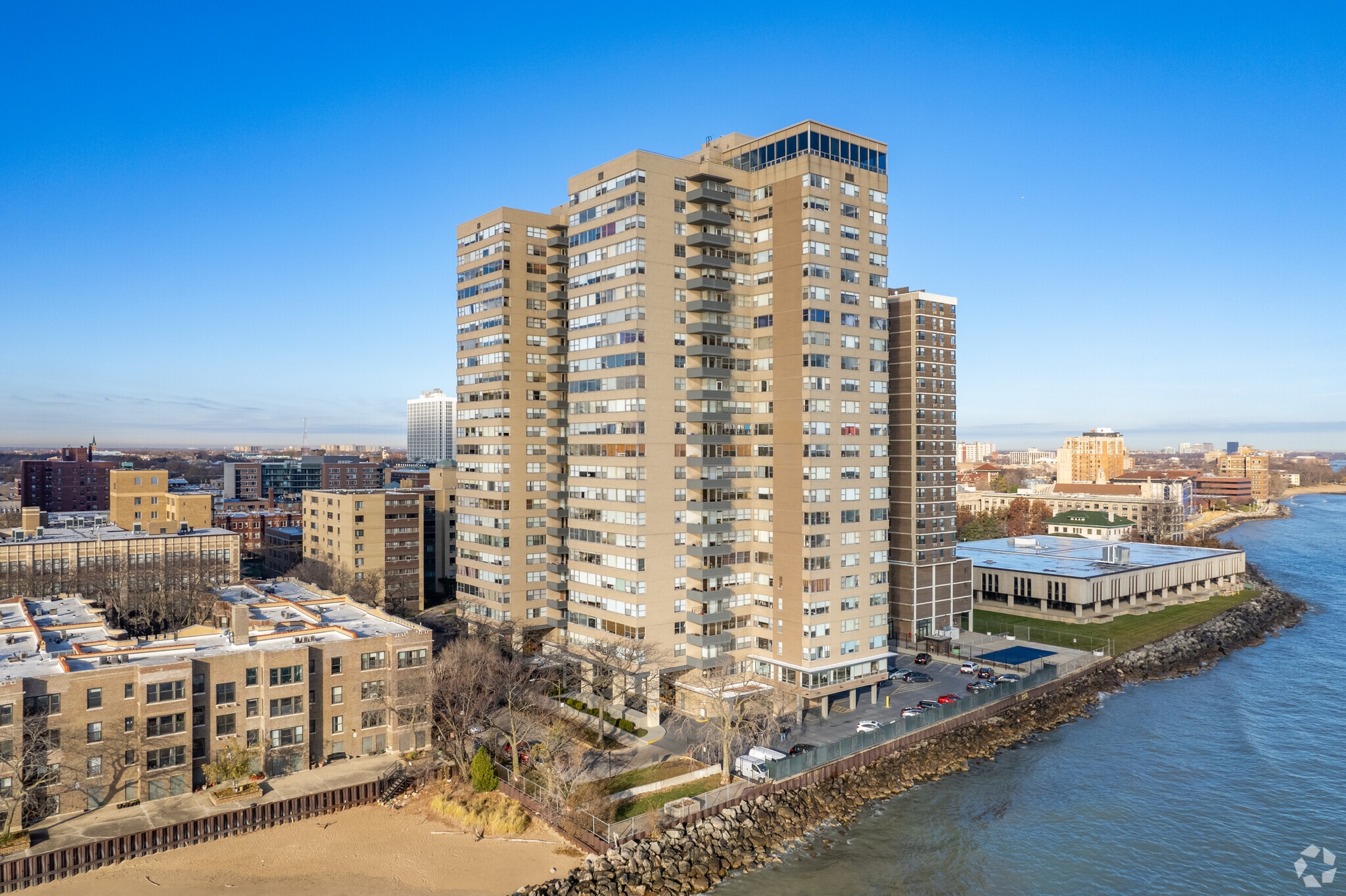 Shoreline Towers Condominiums, a 25-story high-rise completed in 1970, stands as a prominent fixture in Chicago's Edgewater neighborhood. This 378-unit condominium offers residents a prime location along Lake Michigan, combining urban convenience with breathtaking waterfront views. The building's straightforward, modern design features a symmetrical facade with balconies and large windows, providing ample natural light and scenic vistas for its occupants.