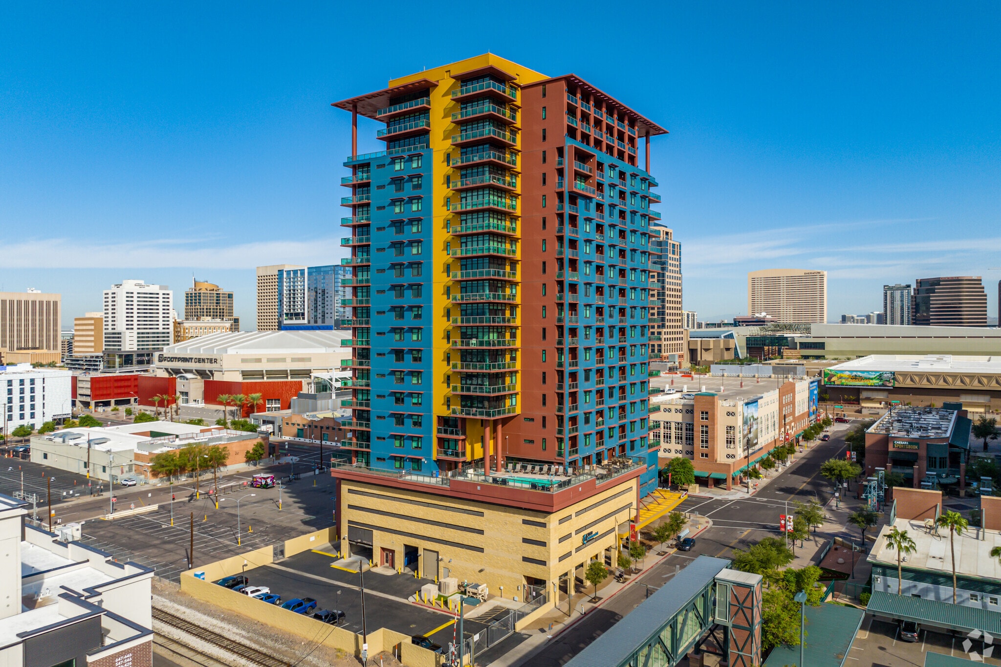 Summit at Copper Square, designed by The Stein-Cox Group, stands as a contemporary high-rise in the vibrant Central City neighborhood of Phoenix. Completed in 2007, this 23-story building houses 165 condo units, each offering a unique blend of modern design and urban convenience. The building's colorful facade, featuring a mix of blue, yellow, and red panels, adds a lively touch to the downtown skyline. With its prime location and thoughtfully designed spaces, Summit at Copper Square provides an ideal setting for those seeking a dynamic urban lifestyle.