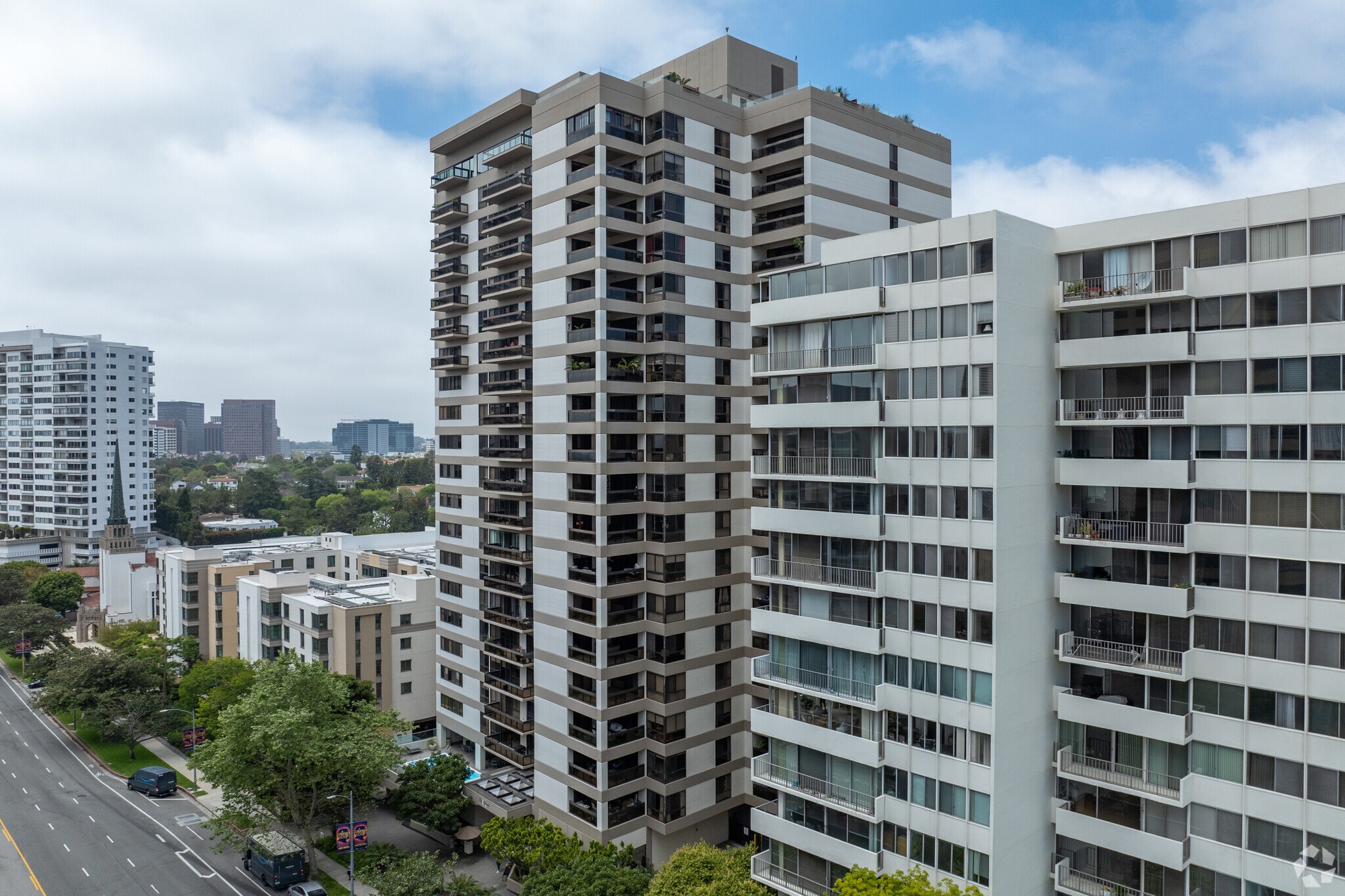 The Grand Westwood Condominiums stands as a prominent fixture on the Wilshire Corridor, offering luxurious living in the heart of Westwood. Completed in 1980, this 21-story high-rise houses 109 condominium units, each designed to provide residents with a sophisticated urban lifestyle. The building's straightforward modern design features a series of balconies that adorn its facade, allowing residents to enjoy the surrounding cityscape. Situated in one of Los Angeles' most sought-after neighborhoods, The Grand combines the prestige of its location with the comfort and convenience of full-service condominium living.