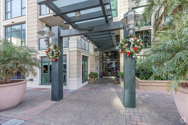 The Grande Santa Fe Place, a striking 39-story high-rise completed in 2005, stands as a prominent fixture in downtown San Diego's skyline. Designed by Perkins & Company Architecture and Urban Design, this contemporary condominium tower houses 389 luxury residences. Situated in the coveted Columbia District, The Grande offers residents a prime location with easy access to the vibrant urban amenities of America's Finest City. The building's sleek glass facade and staggered balconies create a distinctive architectural presence, while its position along the waterfront provides residents with breathtaking views of San Diego Bay and the Pacific Ocean.