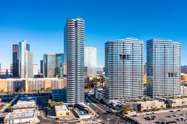 The Martin, a 46-story condominium tower completed in 2007, stands as a prominent fixture in Las Vegas's West of the Strip neighborhood. With 374 units, this high-rise offers residents a prime location just steps away from the city's world-famous entertainment and dining. The building's curved glass facade and rhythmic pattern of balconies create a striking silhouette against the Las Vegas skyline, while its proximity to major attractions like City Center, Allegiant Stadium, and T-Mobile Arena makes it a coveted address for those seeking the quintessential Vegas lifestyle.