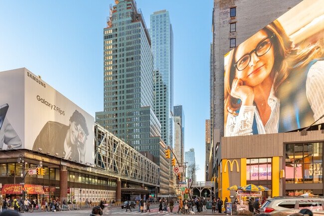 Why would anyone want to live in the heart of Times Square, you ask? For those who love the urbanity, the history, and the nonstop movement of New York, there’s an easy answer: it’s romantic. From the floor-to-ceiling windows of The Orion, there are priceless panoramic views of what many only see in stock images when searching for pictures of the “New York City skyline.” Designed by CentraRuddy – the same architects who designed One Madison Park luxury condominiums – The Orion comprises 60 stories of 551 units with sweeping views of New York City in every direction. From 520-square-foot studios to 1,463-square-foot three-bedrooms, each residence was crafted to maximize space and light with open floor plans and floor-to-ceiling windows. The glass and steel tower is home to a 3-story amenities suite, including relaxation, entertainment, fitness and business facilities. Along with a 24-hour doorman and a full-time concierge, residents have access to a variety of luxury services like housekeeping, massage therapy, and dry cleaning. The Orion is a family- and pet-friendly building offering amenities like a children’s playroom and community rec room. Here, residents can be tourists every day: those sky-high views serve as a reminder of just how beautiful New York City really is. Featuring extra high, 10-foot ceilings, each unit was designed with an open floor plan for spacious living. Floor-to-ceiling windows provide ample daylight and frame panoramic views of Hell’s Kitchen, Times Square, and the Hudson River. The interiors are finished with Wide Plank Hardwood floors, Italian luxury kitchens by Valcucine, Bosch appliances, fixtures by Waterworks and glass tiles by Ann Sacks. Each residence has a dishwasher and central climate control. On floors 30 and up, each residence is outfitted with in-unit washer-dryer. The building is designed in a T-shape with six corner units on each floor. The layouts have more square footage than similar nearby luxury condos – like the apartments at “Middle of Manhattan” (MiMA) and the condos at Atelier – typical to this part of town. A two-bedroom apartment at The Orion has 1,350 square feet, while an average Midtown high-rise 3-bedroom has the same square footage. “The Orion has the best views of any Midtown West high-rise,” says Rex Gonsalves, associate broker at Browns Harris Stevens, who is in the top 1.5% of Real Trend’s nationwide Top Real Estate Professionals. “Unlike the MiMA and Atelier, which are blocked by Hudson Yards, the panoramas are completely open on all sides.” The Orion has an amenities suite with 8,200 square feet spanning three stories – floors 29, 30 and 31. Three expansive outdoor terraces feature chaise lounges for sunbathing and dining areas for entertaining. The fitness center has an indoor two-lane lap pool, a jacuzzi, LifeFitness cardio machines, a yoga/Pilates studio, a massage therapy room and dry saunas. For entertainment, residents can take advantage of the billiard room, a movie theater and the community garden. HOA monthly fees vary by unit and are on par with other luxury buildings in the area. According to Gonsalves, a standard charge for a two-bedroom on the highest floor is $1364. Located on 42nd Street and 9th Avenue, The Orion’s prime location puts residents steps from iconic New York establishments and areas, including the Theater District, the flagship branch of the New York Public Library, the Museum of Modern Art, and 5th Avenue’s legendary stores. That goes the same for dining and drinking. Some of the best bars and restaurants in the city are nearby: residents can peruse the massive, multi-stall food hall Mercado Little Spain, sip cocktails at Darling in the Park Lane hotel, eat a pastry at Sullivan Street Bakery, and try the chef’s tasting prix fixe menu at Le Bernardin. For groceries, residents can shop at Food Emporium or Whole Foods, both along 42nd Street. The building offers onsite, designated parking in its in-house lot. But New Yorkers know that the subway is, 99% of the time, the fastest way to get anywhere. Because of the proximity to Times Square and Bryant Park, endless train options exist. The A, C and E trains are accessible at 42 St-Port Authority Bus Terminal. From Times Sq-42 St, the N, Q, R, S, W, 1, 2, 3 and 7 trains can transport residents to almost anywhere in New York City. If those were enough options, there’s also 42 St- Byrant Park, which services the B, D, F and M trains. “Beyond the amenities, the location is why people move here,” says Gonsalves. “When you exit the subway, tourists go eastwards to Times Square. Residents go west. Parents buy units in this building for students who go to NYU, FIT, and Columbia because there are trains in every direction.”