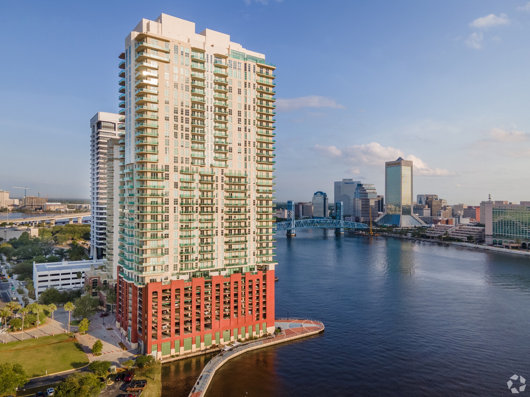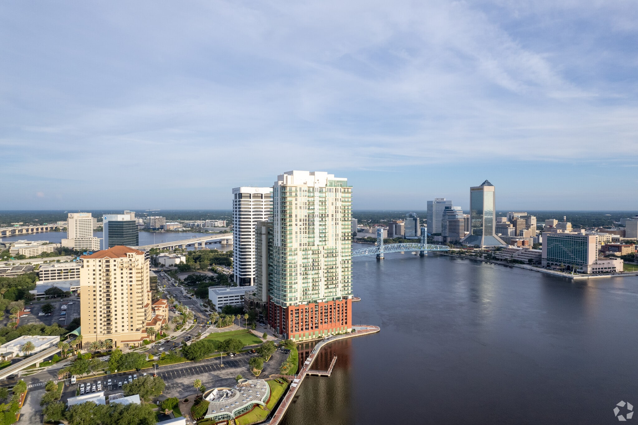 The Peninsula at St. Johns Center is a striking 37-story high-rise condominium located on the Southbank of the St. Johns River in Jacksonville, Florida. Designed with modern elegance, this building was completed in 2008 and houses 241 luxurious units. Its prominent red lower section and glass and balcony facade make it a standout structure along the waterfront, offering residents unparalleled views of the river and downtown Jacksonville. The Peninsula combines sophisticated living with a prime location, making it a coveted address in the city.