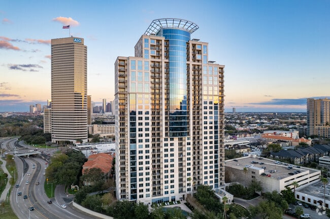 The Royalton at River Oaks stands as a prominent 33-story condominium tower in Houston's vibrant Montrose neighborhood. Completed in 2003, this modern high-rise offers 253 units with sweeping views of Buffalo Bayou Park and the Houston skyline. The building's curved glass top and mix of glass and stone facade elements create a distinctive silhouette against the city's backdrop. Situated in the heart of Montrose, The Royalton provides residents with a perfect blend of urban convenience and serene parkside living.