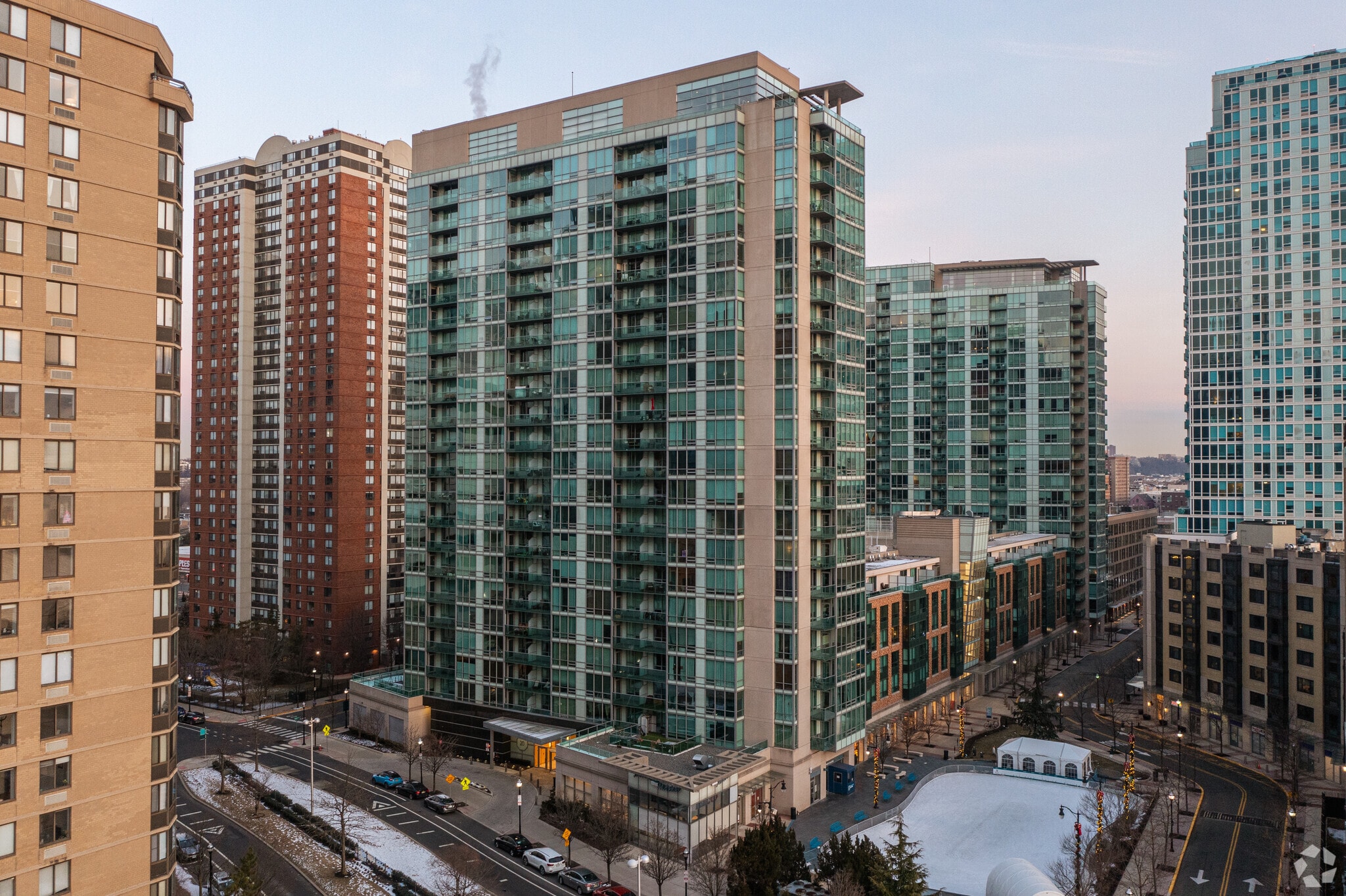 The Shore Club, a striking 22-story condominium, stands tall with its modern glass facade and grid-like pattern of windows. Completed in 2008, this high-rise offers 850 units and is located in the vibrant Waterfront neighborhood of Jersey City. The building's slightly curved glass front at the corner adds a unique architectural touch, making it one of the more prominent structures in the area. The Shore Club is designed to provide residents with an abundance of natural light and breathtaking views of the Hudson River and the Manhattan skyline.