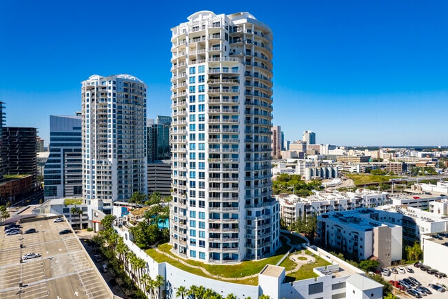 Towers of Channelside, a striking 30-story high-rise, stands as a prominent feature in Tampa's Channel District. Completed in 2007, this contemporary building houses 257 condominium units, offering residents a blend of luxury and convenience. The building's curved facade and rhythmic pattern of balconies create a distinctive architectural presence, making it a notable landmark in the area.