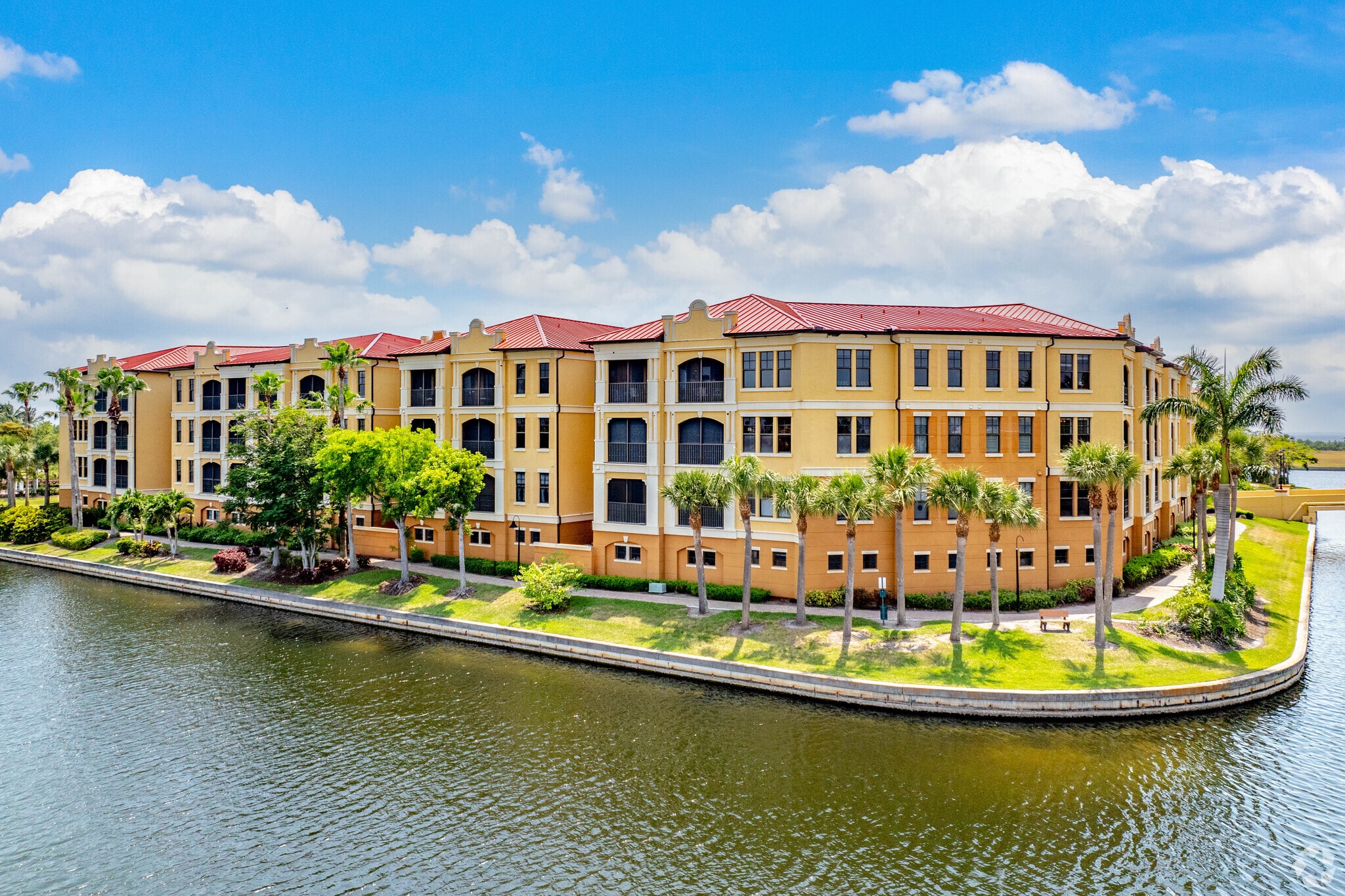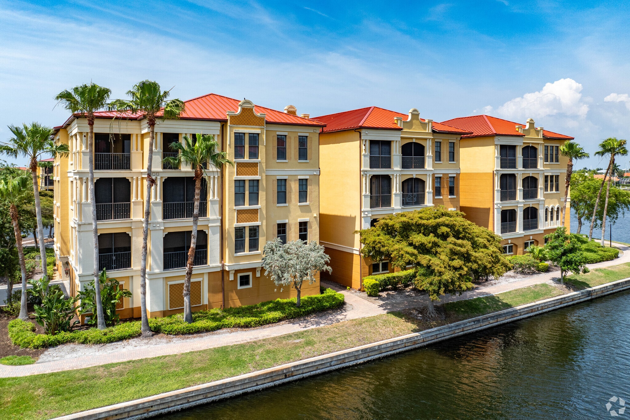 Vivante at Punta Gorda stands as a testament to elegant coastal living in Punta Gorda. Completed in 2007, this Mediterranean Revival-style condominium complex features 342 units spread across four stories. The building's stucco walls, arched windows, and red tile roofs create a distinctive silhouette against the Florida sky. Situated on a waterfront property, Vivante offers residents a blend of luxury and tranquility, with many units boasting views of the surrounding lakes and Charlotte Harbor in the distance.