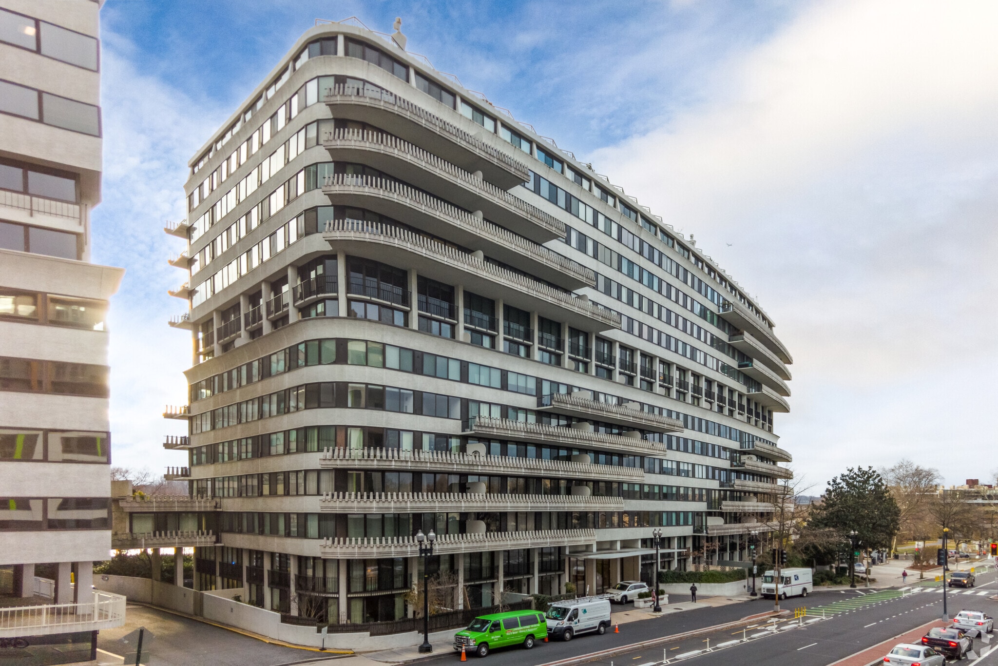 Watergate West Residences, a hallmark of Modernist architecture, stands 13 stories tall in the historic Foggy Bottom neighborhood. Designed with clean lines and extensive use of glass, the building was completed in 1965 and houses 143 condominium units. Its repetitive balcony patterns emphasize horizontal lines, creating a sleek and cohesive aesthetic. Located near the Potomac River, this building offers a blend of historical significance and modern convenience, making it a notable residence in Washington, D.C.