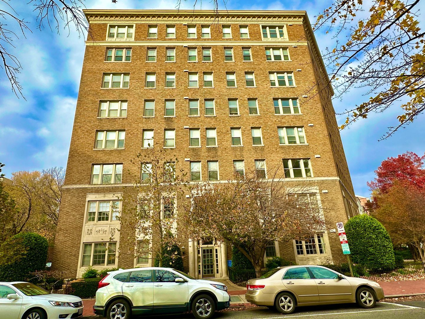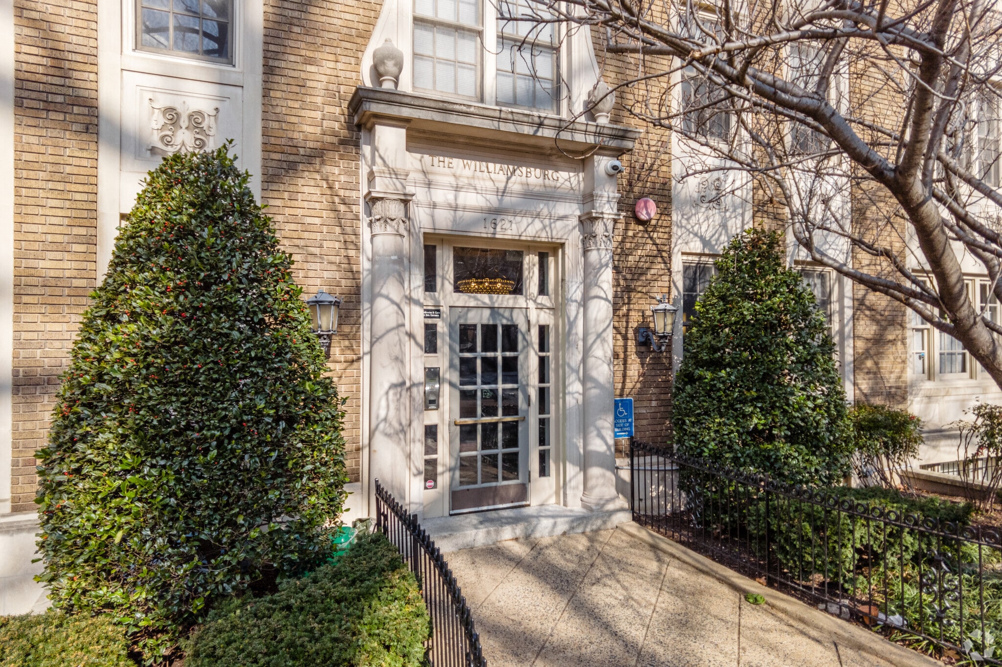 Williamsburg Condominium, an eight-story brick building, stands proudly in the vibrant Dupont Circle neighborhood. Completed in 1925, this classic structure features 61 units and is known for its symmetrical facade and simple, unadorned windows. The entrance is marked by a classical portico with decorative elements, adding a touch of elegance to the building's exterior. Located in one of Washington D.C.'s most sought-after areas, Williamsburg Condominium offers a blend of historic charm and modern convenience.