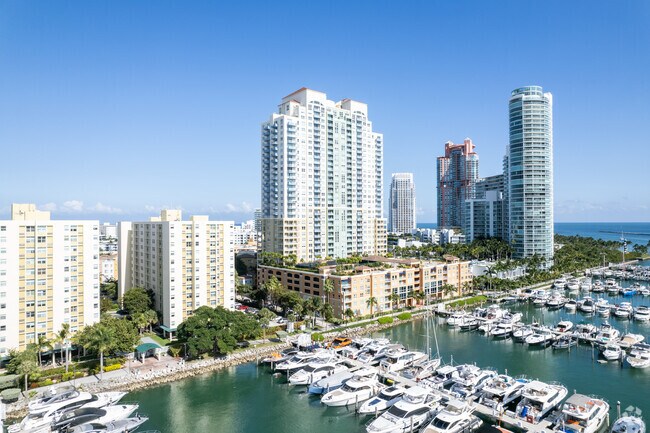 The Yacht Club at Portofino, designed by Cohen Freedman Encinosa, is a striking 33-story condominium located in the exclusive South Pointe neighborhood of Miami Beach. Completed in 1999, this high-rise features 361 units and offers residents a luxurious lifestyle with stunning views of Biscayne Bay, Downtown Miami, and the Atlantic Ocean. The building's symmetrical facade, with its central section flanked by two slightly recessed wings and ornamental crowns on the rooftop, adds to its distinctive presence in the Miami skyline.
