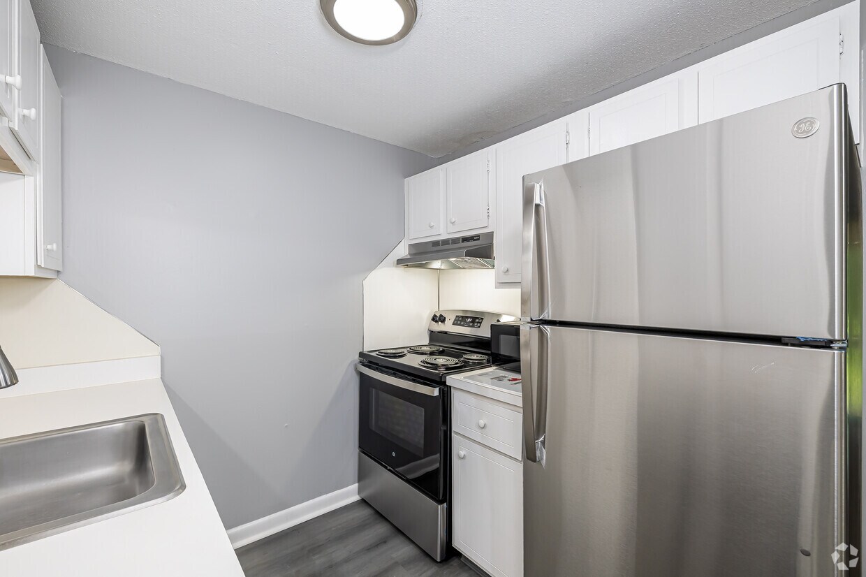 Estilo clásico con electrodomésticos de acero inoxidable.