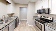 Cocina con encimeras de granito y electrodomésticos de acero inoxidable.