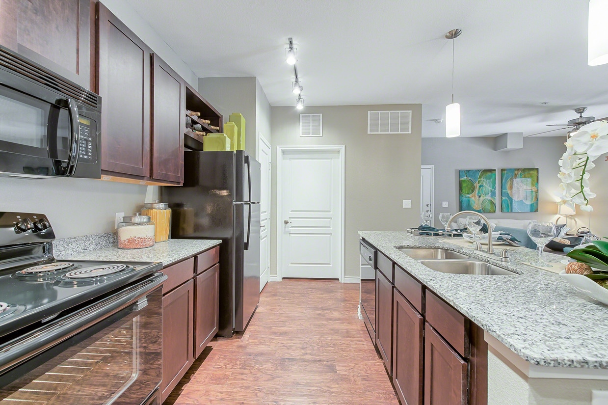 Cocina de Latigo en Eagle Pass con electrodomésticos negros y encimeras de granito