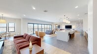 This contemporary 960 square foot residence, located at 5 Ledge Dr in Schenectady, NY, showcases a thoughtfully designed single-floor layout. The space is characterized by its open-concept design, seamlessly integrating the kitchen and living areas. The kitchen boasts a clean, modern aesthetic with white cabinetry, stainless steel appliances, and a spacious island with seating. The living area is a testament to contemporary design, featuring a neutral color palette, hardwood flooring, and distinctive circular pendant lights. Large windows flood the space with natural light and offer views of the surrounding landscape. The room is furnished with a combination of sleek and plush seating options, including a cream-colored sofa and green accent chairs. Throughout the property, attention to detail is evident in the carefully chosen lighting fixtures, from the modern chandelier in the entryway to the linear ceiling lights in the kitchen. The space also includes a stylish lobby area with textured walls, designer furniture, and glass sliding doors, further emphasizing the property's commitment to modern, functional design.