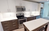 Las cocinas completamente nuevas cuentan con modernos gabinetes bicolor, encimeras de cuarzo y una isla.