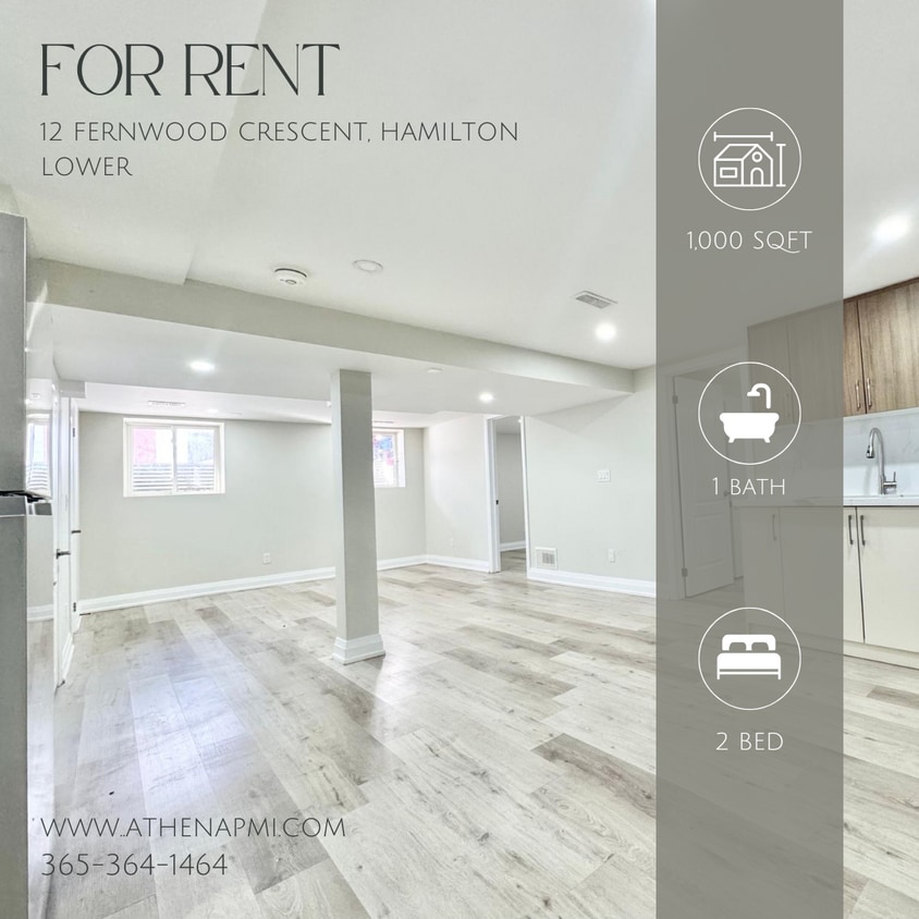 12 Fernwood Crescent, Hamilton – Rez-de-chaussée. Ce logement de 2 chambres et 1 salle de bain, situé au rez-de-chaussée et récemment rénové, offre des améliorations modernes, un espace de vie généreux et des finitions soignées. Il bénéficie d'un emplacement idéal dans un quartier résidentiel paisible de Hamilton. Caractéristiques : Environ 93 m² de surface habitable ; 2 chambres spacieuses avec placards ; Salle de bain entièrement rénovée avec douche à l'italienne ; Espace de vie ouvert comprenant salon, salle à manger et cuisine ; Électroménagers en acier inoxydable : réfrigérateur et cuisinière ; Buanderie privée ; Entrée latérale privée ; Une place de stationnement dans l'allée. Commodités à proximité : Proche des écoles, des parcs et des commerces ; Accès facile aux principaux axes routiers et autoroutes de Hamilton ; Quartier calme et familial avec arbres matures et larges rues. Loyer : 1 900 $/mois + 45 % des charges. Disponibilité : Immédiate. Visite : Appelez-nous : Planifiez une visite en ligne : (Copiez et collez le lien dans votre navigateur si nécessaire) Demandez une visite virtuelle par courriel :