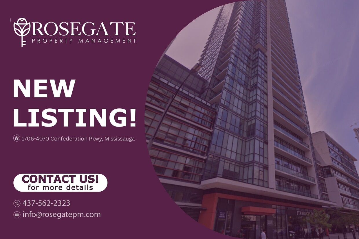Appartement moderne d'une chambre avec parking et balcon privé à Mississauga Bienvenue à l'unité 1706 au 4070, promenade Confederation, à Mississauga ! Ce condominium bien entretenu d'une chambre et une salle de bain offre environ 550 pi² d'espace de vie moderne au cœur de Mississauga. Cette unité est idéale pour les professionnels à la recherche d'une propriété locative pratique et gérée par des professionnels en Ontario, à proximité de Square One et des principaux axes de transport en commun. Ce condo offre un agencement fonctionnel avec un espace de vie ouvert, une chambre confortable et une salle de bain moderne. De grandes fenêtres et un accès à un balcon privé laissent entrer la lumière naturelle et créent un espace accueillant pour se détendre ou admirer la vue sur la ville. Parmi les autres atouts, citons une place de parking réservée, gage de commodité au quotidien pour les navetteurs. L'emplacement central de l'immeuble vous place à quelques minutes des commerces, restaurants, parcs et transports en commun, facilitant ainsi vos déplacements quotidiens et l'accès au centre-ville. Géré par Rosegate Property Management, une entreprise de gestion immobilière locative de confiance en Ontario, ce condo à louer à Mississauga offre confort, emplacement idéal et tranquillité d'esprit. Un logement urbain à prix avantageux avec stationnement et balcon — planifiez une visite dès aujourd'hui.