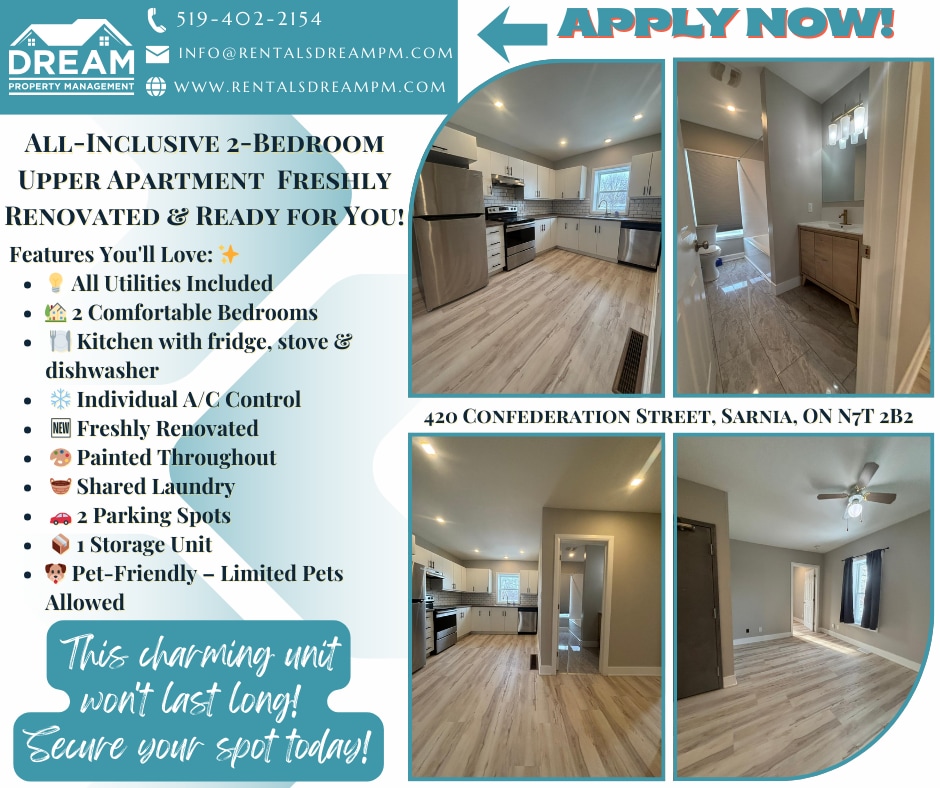 Appartement 2 chambres à l'étage, tout inclus – Fraîchement rénové et prêt à vous accueillir ! Profitez d'une vie sans tracas dans ce superbe appartement 2 chambres à l'étage, récemment rénové et tout inclus. Un seul loyer mensuel couvre toutes vos charges. Ce logement est conçu pour vous faire économiser de l'argent et vous offrir un confort optimal toute l'année ! Ses atouts : - 2 chambres confortables – Des espaces lumineux et accueillants pour des nuits reposantes. - Cuisine équipée – Réfrigérateur, cuisinière et lave-vaisselle inclus pour préparer vos repas en toute simplicité. - Climatisation individuelle – Réglez la température à votre convenance. - Entièrement rénové et repeint – Un style moderne et épuré, comme neuf. - Buanderie commune – Un espace buanderie partagé pour votre confort. - Lumineux et agréable – L'appartement bénéficie d'une abondante lumière naturelle. Autres avantages : - Toutes les charges sont comprises – Un seul loyer mensuel, sans frais supplémentaires ! - 2 places de parking – Plus besoin de vous soucier du stationnement dans la rue. - 1 unité de rangement – Espace supplémentaire pour une organisation optimale. - Animaux acceptés – Nombre limité d'animaux (des restrictions peuvent s'appliquer). - Non-fumeur – Environnement propre et sain. - Emplacement idéal. Points forts du quartier : * Écoles : - École publique PE McGibbon (1,4 km) - Académie Royal SCITS (1,5 km) - École publique London Road (2,2 km) - École publique Hanna Memorial (2,4 km) * Services de santé : - Clinique Mackenzie (1,6 km) - Centre de santé Bluewater Sarnia (2,5 km) - Clinique dentaire Lambton Family (3,4 km) * Commerces et épiceries : - Marché du centre-ville (1,9 km) - London Food Mart (2,0 km) - Food Basics (2,2 km) Exigences : (Seuls les candidats qualifiés seront contactés) - Candidature en ligne : - Premier et dernier mois de loyer + dépôt de garantie - Vérification de crédit et références - Assurance locataire - Déneigement : Le locataire est responsable de sa portion d'allée. Prêt à emménager ? Déposez votre candidature dès aujourd'hui ! - Courriel : - Téléphone : - Postulez maintenant : Votre logement idéal vous attend ! Ne ratez pas cette occasion ! *Avertissement : Les distances sont approximatives et basées sur Google Maps. Bien que jugées fiables, les informations fournies ne sont pas garanties et doivent être vérifiées indépendamment. Veuillez noter que tous les contrats de location doivent être conformes à la Loi sur la location résidentielle de l'Ontario.