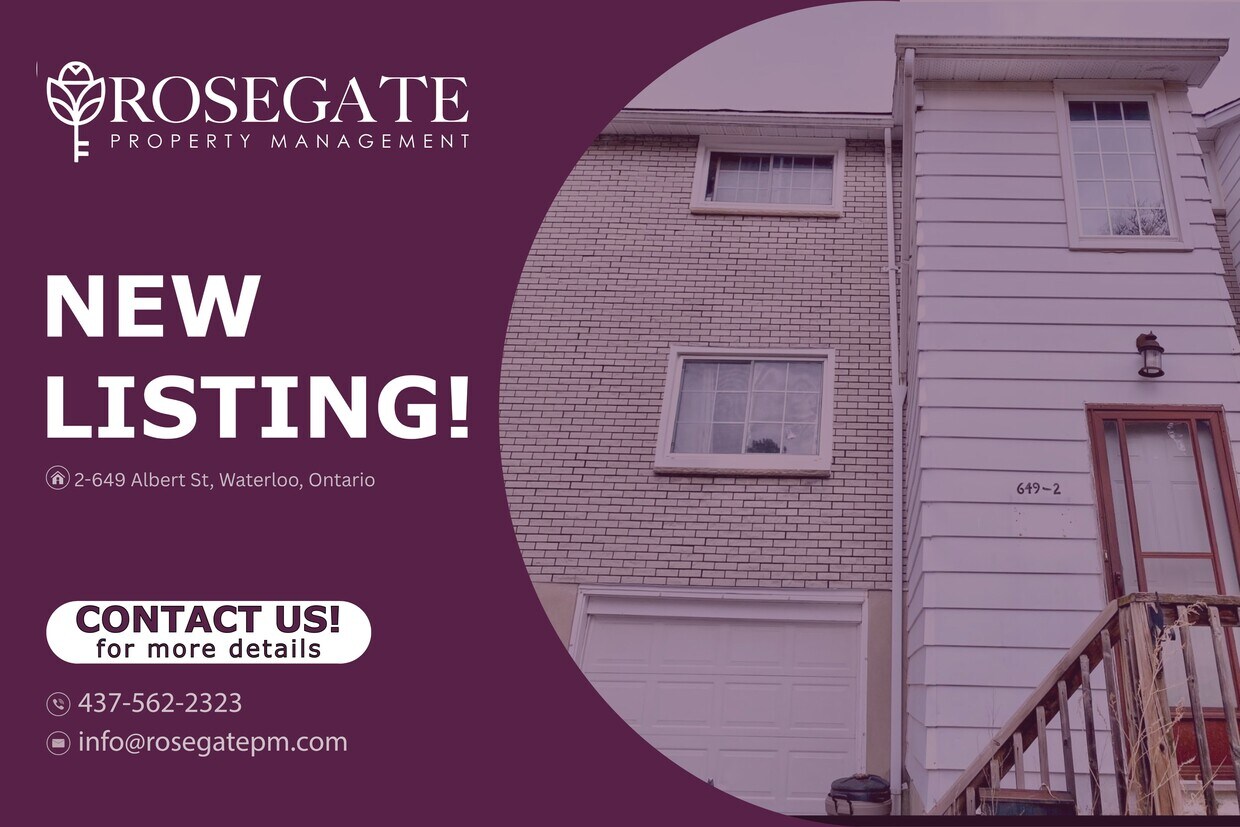 Spacieuse maison de ville superposée de 3 chambres avec garage et cour arrière à Waterloo Bienvenue au 2-649, rue Albert, à Waterloo ! Cette maison de ville en duplex, bien entretenue, offre environ 1 100 pi² d’espace de vie confortable dans un quartier pratique et familial. Avec ses 3 chambres et sa salle de bain et demie, cette maison acceptant les animaux de compagnie est idéale pour les familles, les professionnels ou les étudiants à la recherche d’une propriété locative gérée par des professionnels en Ontario. L'agencement fonctionnel comprend un salon et une salle à manger lumineux, conçus pour un confort quotidien. La chambre principale dispose d'un dressing, offrant un espace de rangement optimal et un confort accru. Toutes les chambres sont spacieuses, permettant une grande flexibilité pour la vie familiale, le télétravail ou la colocation. Profitez d'un cadre de vie extérieur avec une véranda et un jardin, parfaits pour se détendre ou passer du temps au grand air. Le stationnement est aisé grâce à une place de parking réservée et un garage privé, un atout rare et précieux pour une maison de ville à louer à Waterloo. Gérée par Rosegate Property Management, une agence immobilière locative de confiance en Ontario, cette maison de ville à louer à Waterloo est située à proximité des universités, des transports en commun, des commerces, des parcs et de toutes les commodités. Spacieuse et acceptant les animaux de compagnie, elle comprend un garage et un espace extérieur. Planifiez votre visite dès aujourd'hui !