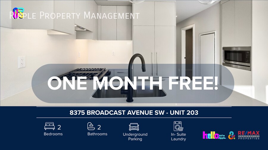 SUPERBE APPARTEMENT NEUF JAMAIS HABITÉ DE 2 CHAMBRES ET 2 SALLES DE BAINS | ANIMAUX ACCEPTÉS | UN MOIS GRATUIT POUR UNE EMMÉNAGEMENT AVANT LE 1ER MARS 2026 Bienvenue dans votre futur chez-vous ! Ce magnifique appartement, situé au 8375 Broadcast Avenue SW, unité 203, offre un parfait équilibre entre confort, style et commodités dans le quartier de West Springs. VISITES : Journées portes ouvertes – réservez dès aujourd'hui ! Les prix, la disponibilité et les promotions sont sujets à modification sans préavis. Caractéristiques : - Meublé ou non meublé : Non meublé - Charges incluses : Gaz naturel et eau - Animaux : Un animal autorisé. Frais mensuels de 50 $ - Fumeurs : Non-fumeur - Stationnement : Souterrain - Rangement inclus : Oui - Buanderie : Dans l'appartement - Type de gestion : Gestion complète - Durée du bail : Longue durée Pourquoi vous allez l'adorer : - Cuisine moderne : Entièrement équipée avec des appareils haut de gamme, incluant réfrigérateur/congélateur, plaque de cuisson, four, hotte, micro-ondes et lave-vaisselle. - Finitions de qualité : Revêtements de sol modernes et murs/plinthes impeccables dans l’entrée, le salon et les chambres. - Lumineux et aéré : Grandes fenêtres avec stores/rideaux déjà installés dans toutes les pièces principales. - Balcon privé : Espace extérieur accessible directement depuis le salon. Avantages de l’immeuble : - Salle de sport : Studio de fitness entièrement équipé, réservé aux résidents, situé dans l’immeuble. - Salon des propriétaires : Espace de coworking et de détente convivial, idéal pour travailler à distance ou se relaxer entre voisins. - Terrasse sur le toit : Terrasse extérieure partagée avec tables de feu, parfaite pour recevoir. - Toilettes pour animaux : Station de lavage pour chiens sur place. - Parking souterrain et station de lavage : Parking souterrain sécurisé et chauffé avec station de lavage réservée aux résidents. - Local à vélos : Local à vélos sécurisé. Atouts de l’emplacement : - Situé directement sur la rue principale du quartier, à deux pas de restaurants populaires comme UNA Pizza + Wine, Blanco Cantina et Deville Coffee. - Adjacent au parc Radio de 3,4 hectares, qui comprend un amphithéâtre ouvert toute l'année, un parc aquatique estival et une patinoire extérieure en hiver. - Accès inclus à « Radio Bark », un parc canin clôturé et sans laisse situé au cœur de l'espace vert. - À distance de marche de plusieurs centres de conditionnement physique haut de gamme, dont F45 Training et HotShop Hot Yoga. - À seulement 5 minutes en voiture de WinSport (Parc olympique du Canada) pour le ski, le snowboard et le vélo de montagne. - Accès direct à Stoney Trail et à Old Banff Coach Road pour une escapade rapide à la montagne, en évitant la circulation urbaine. - À quelques minutes des principaux supermarchés, banques et services essentiels situés à West 85th et Westside Shoppes. Offre spéciale : UN MOIS GRATUIT ! Économies exceptionnelles équivalentes à un mois de loyer (maximum), réparties uniformément sur votre bail de 12 mois. Pour les baux d'une durée initiale inférieure à 12 mois, l'avantage sera calculé au prorata. Réservez votre visite dès aujourd'hui ! Cette offre ne restera pas longtemps sur le marché.