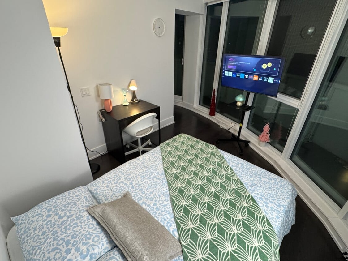 Chambre à louer : Location de chambre de luxe premium dans le centre de Toronto Située dans notre appartement au carrefour animé de York Street et Bremner Boulevard, la chambre Premium Deluxe allie confort et fonctionnalité au cœur de Toronto. Spacieuse et meublée avec goût, elle comprend un lit double, un bureau, une table de chevet et une télévision connectée moderne de 40 pouces, idéale pour ceux qui recherchent un espace de vie à la fois pratique et chaleureux. Ses grandes fenêtres laissent entrer une abondante lumière naturelle et offrent une vue imprenable sur le paysage urbain. Cette chambre donne accès à une salle de bain partagée, pour un équilibre parfait entre luxe et convivialité. Appartement : York St & Bremner Blvd Optez pour une élégance abordable dans notre appartement idéalement situé à l'angle de York Street et Bremner Boulevard. Ce choix est parfait pour les locataires recherchant un excellent rapport qualité-prix en plein centre-ville. L'appartement comprend 4 chambres et 2 salles de bains modernes, garantissant intimité et confort. Des commodités essentielles sont incluses, telles qu'un service de conciergerie, une salle de sport équipée, une buanderie privative et un local à vélos. Situé juste en face d'une station de métro, il offre un accès privilégié aux transports en commun. Quartier : Centre de Toronto Situé au cœur du quartier animé de Toronto, notre appartement à l'angle de York Street et Bremner Boulevard est très apprécié pour son emplacement idéal, à proximité de tous les commerces et services, y compris les transports en commun et les pistes cyclables. Profitez des meilleurs cafés, parcs et lieux de vie nocturne de la ville, accessibles en quelques minutes à pied. La proximité du métro facilite grandement votre quotidien et vous permet d'explorer aisément les nombreuses attractions de Toronto. Choisir cet appartement est une excellente décision pour ceux qui privilégient l'emplacement et un prix abordable. Il offre une location de chambre Premium Deluxe pratique à Toronto, avec toutes les commodités nécessaires et une excellente desserte par les transports en commun. Veuillez noter que les images présentées sont à titre indicatif seulement et que la chambre et l'appartement réels peuvent différer. Nous vous recommandons fortement une visite sur place ou une visite virtuelle pour apprécier pleinement l'espace de vie et son environnement.
