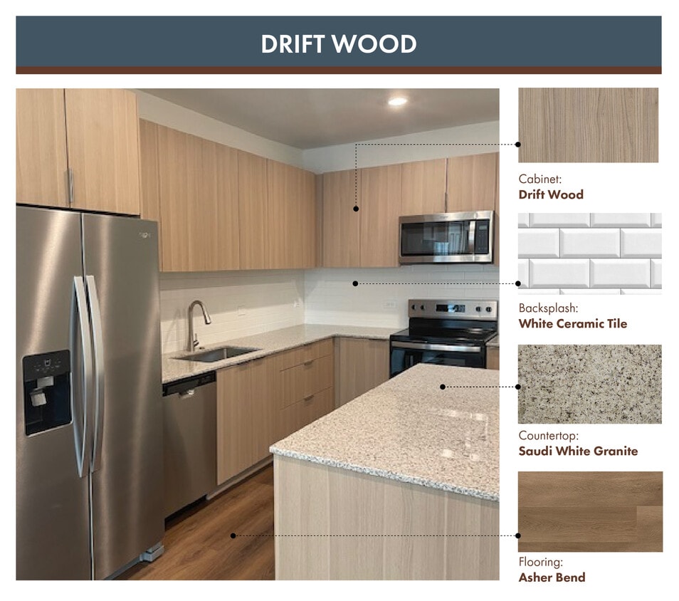 - Neutral granite countertops with coordinating backsplashes, paired with modern wood-style cabinetry
