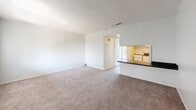Located in Largo, Florida, this one-bedroom, one-bathroom residence offers a well-organized single-floor layout designed for efficient, comfortable living. The open living room is finished with soft wall-to-wall carpeting and a textured ceiling, creating a clean, neutral backdrop. A sliding glass door leads to a private balcony that overlooks a scenic water view surrounded by lush greenery, bringing natural light and pleasant outdoor scenery into the main living space. A closet is conveniently positioned adjacent to the balcony door, adding practical storage within the living area. The kitchen is defined by a peninsula counter with dark granite-style countertops and white cabinetry, accessible through a pass-through opening that connects it to the living area. Wood-look flooring transitions the kitchen and wet areas from the carpeted living and sleeping spaces. The bedroom is a quiet, carpeted room with a textured ceiling, accompanied by its own closet. The bathroom features a vanity with dark countertops, a large mirror with overhead lighting, wood-look flooring, and a shower-tub combination, maintaining the same cohesive design found throughout the home. Overall, the space presents a clean, functional layout with consistent finishes and a refreshing balcony view.