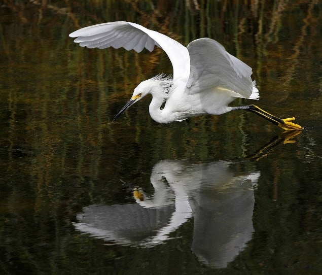 A blue heron in the water near a golf course