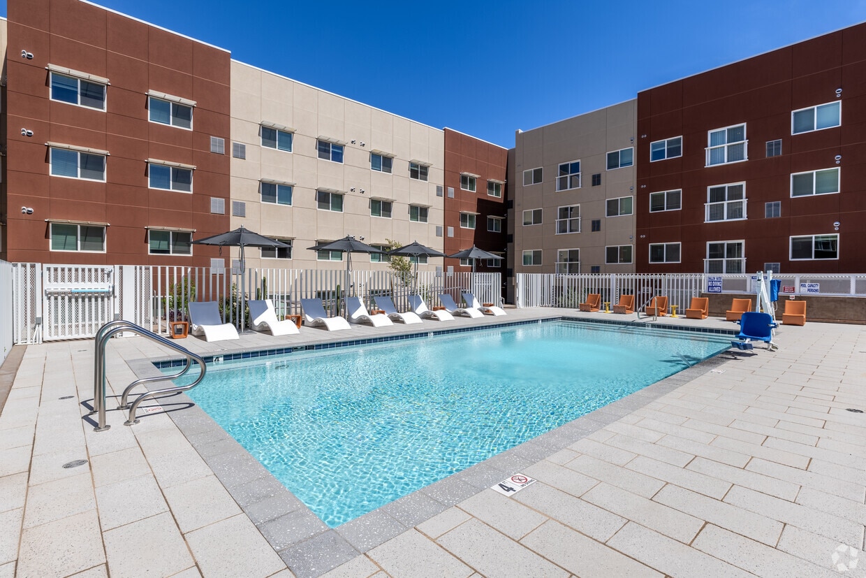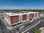 Modern 198-unit midrise apartment community in Downtown Mesa featuring a rooftop resort-style pool, 24/7 fitness center, resident lounge, and on-site garage parking. Elevated urban living in the heart of it all.